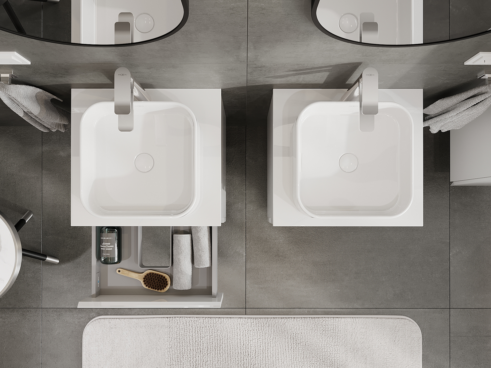 Utskärningen i lådan är utformad på ett sådant sätt att den rymmer vattenlåset som är nödvändigt i tvättställsinstallationer. Tack vare detta kan möbeln installeras fullt ut funktionellt, utan att behöva avstå från utrymme i lådan för installationen.