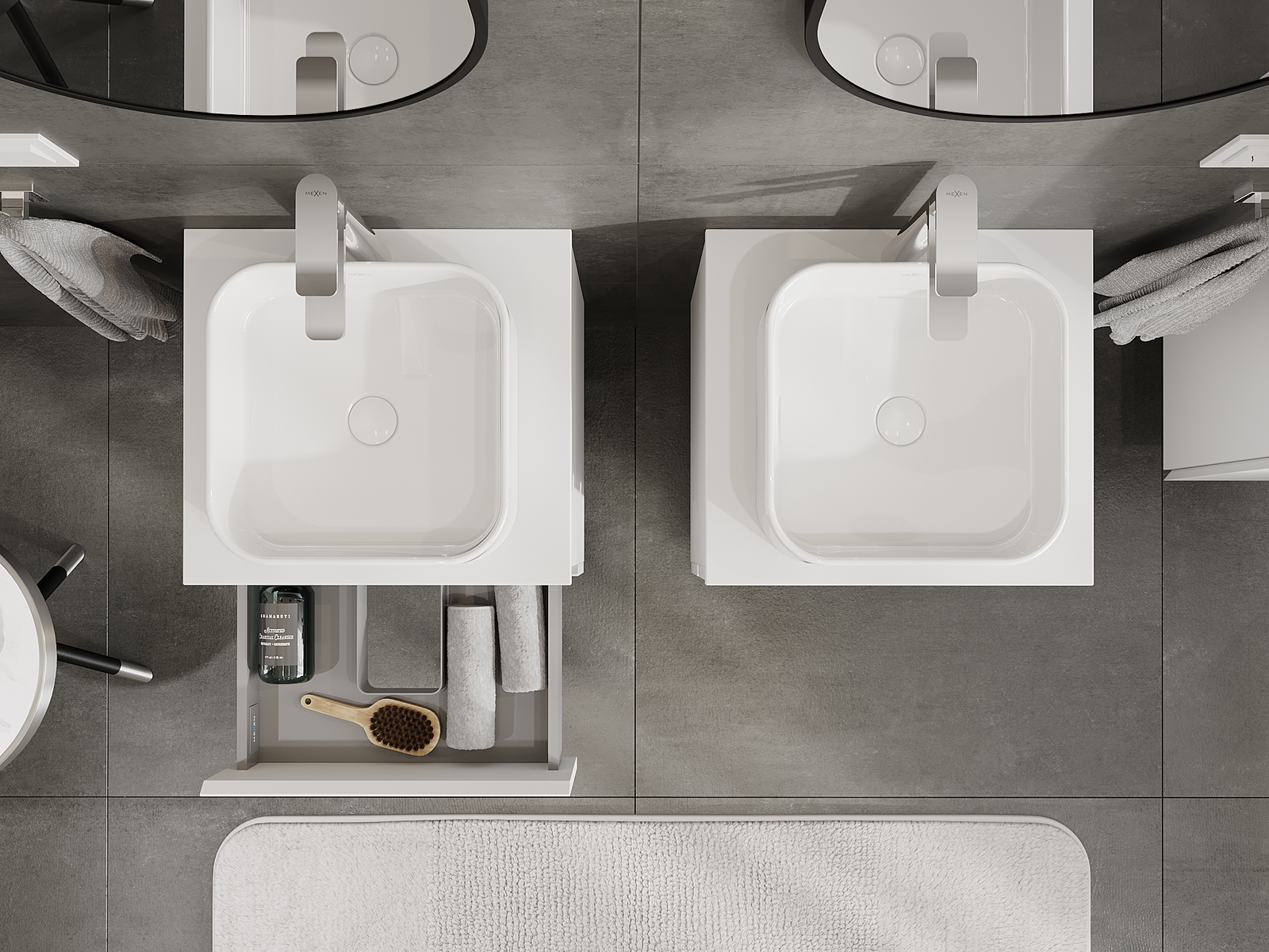 Utskärningen i lådan är utformad på ett sådant sätt att den rymmer vattenlåset som är nödvändigt i tvättställsinstallationer. Tack vare detta kan möbeln installeras fullt ut funktionellt, utan att behöva avstå från utrymme i lådan för installationen.
