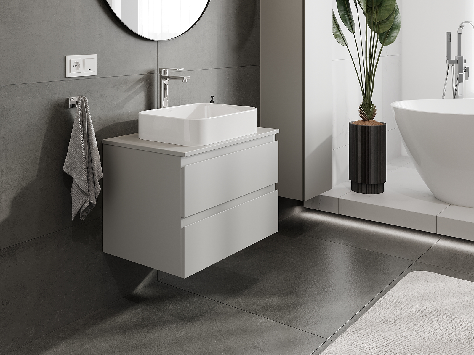 Våra modulära badrumsmöbler kan kombineras i olika färgkonfigurationer, vilket möjliggör fullständig personalisering. Du kan välja både utseende och funktioner för respektive delar, vilket gör att möblerna kan anpassas till dina egna stilistiska och funktionella preferenser.