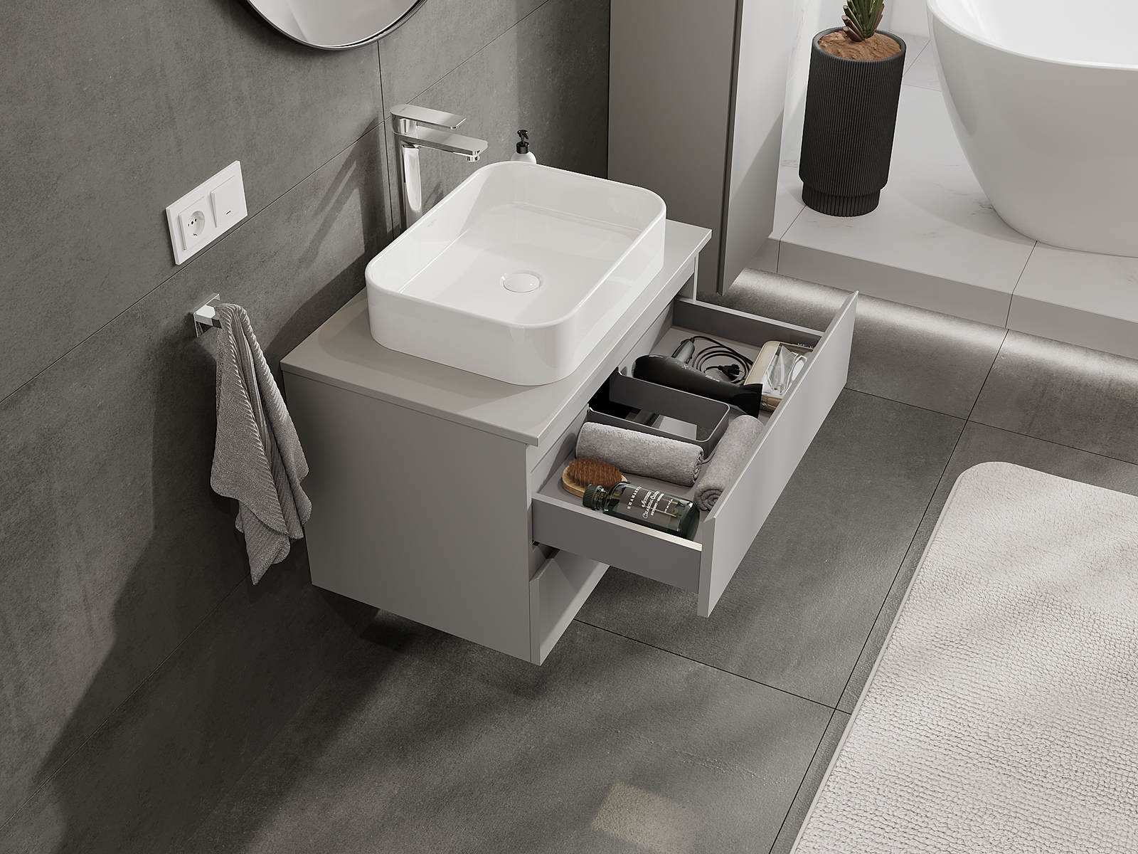 Utskärningen i lådan är utformad på ett sådant sätt att den rymmer vattenlåset som är nödvändigt i tvättställsinstallationer. Tack vare detta kan möbeln installeras fullt ut funktionellt, utan att behöva avstå från utrymme i lådan för installationen.