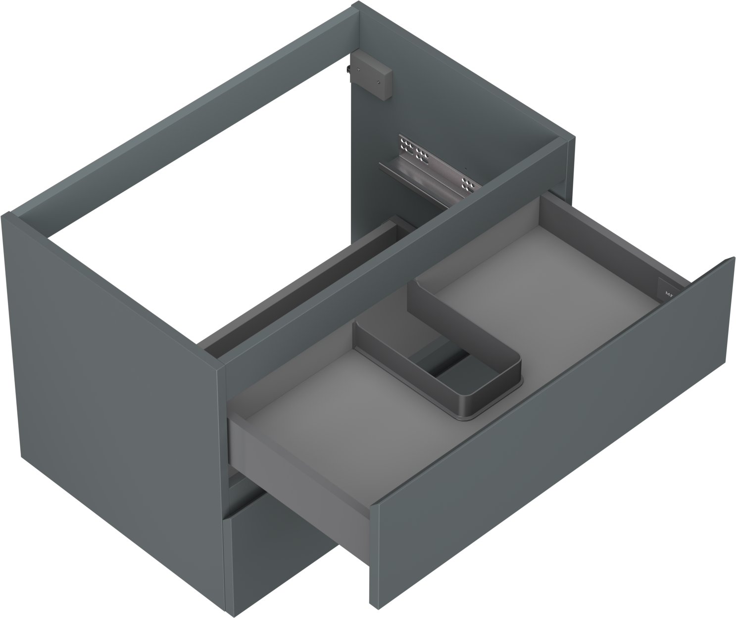 Utskärningen i lådan är utformad på ett sådant sätt att den rymmer vattenlåset som är nödvändigt i tvättställsinstallationer. Tack vare detta kan möbeln installeras fullt ut funktionellt, utan att behöva avstå från utrymme i lådan för installationen.