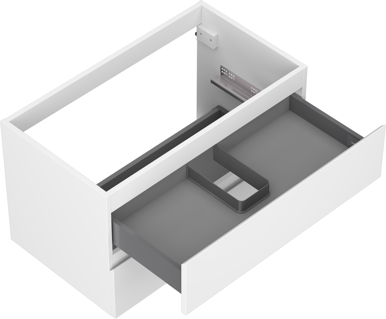 Utskärningen i lådan är utformad på ett sådant sätt att den rymmer vattenlåset som är nödvändigt i tvättställsinstallationer. Tack vare detta kan möbeln installeras fullt ut funktionellt, utan att behöva avstå från utrymme i lådan för installationen.