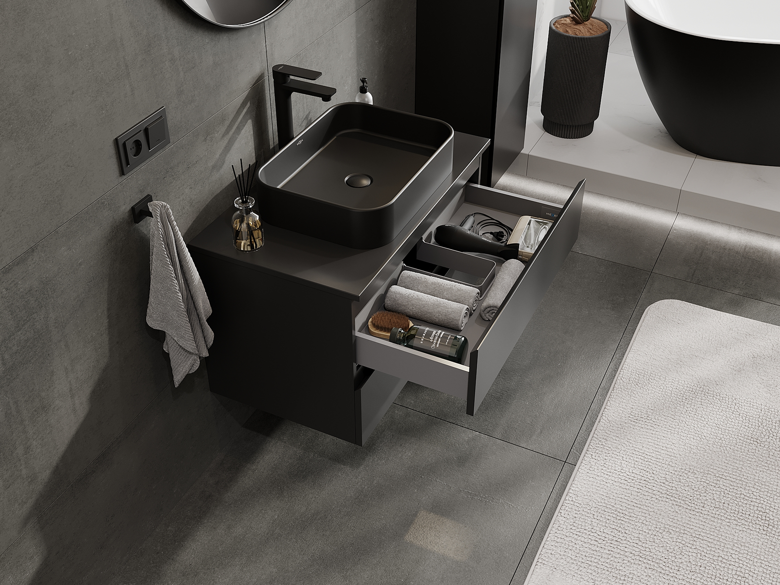 Utskärningen i lådan är utformad på ett sådant sätt att den rymmer vattenlåset som är nödvändigt i tvättställsinstallationer. Tack vare detta kan möbeln installeras fullt ut funktionellt, utan att behöva avstå från utrymme i lådan för installationen.