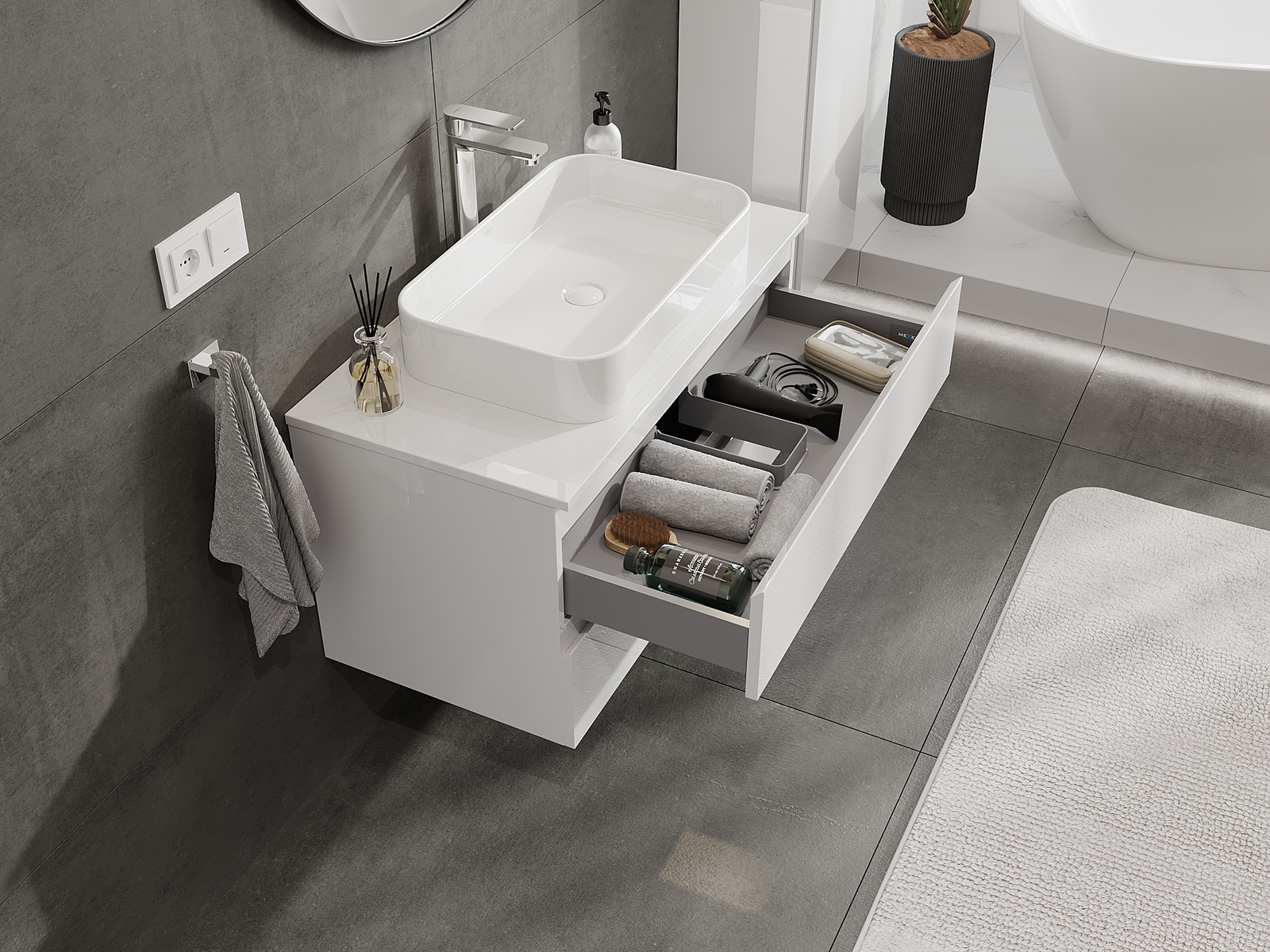 Utskärningen i lådan är utformad på ett sådant sätt att den rymmer vattenlåset som är nödvändigt i tvättställsinstallationer. Tack vare detta kan möbeln installeras fullt ut funktionellt, utan att behöva avstå från utrymme i lådan för installationen.
