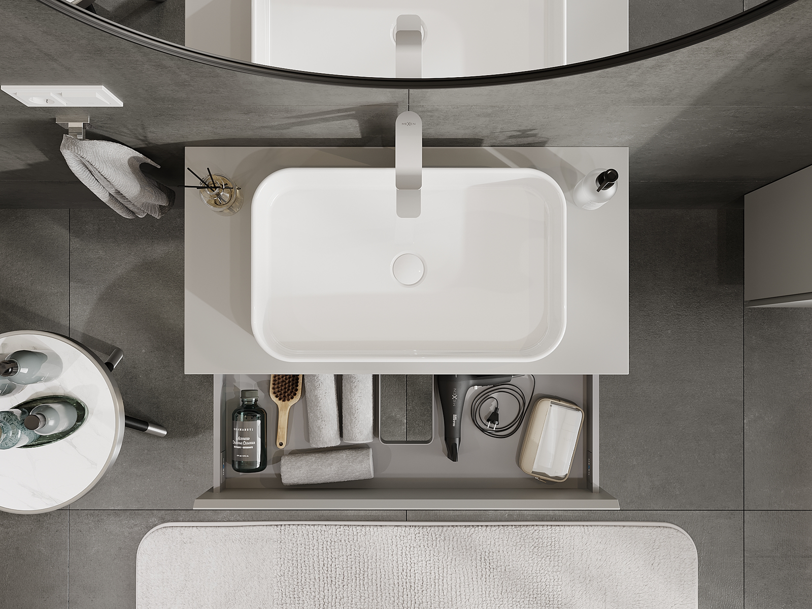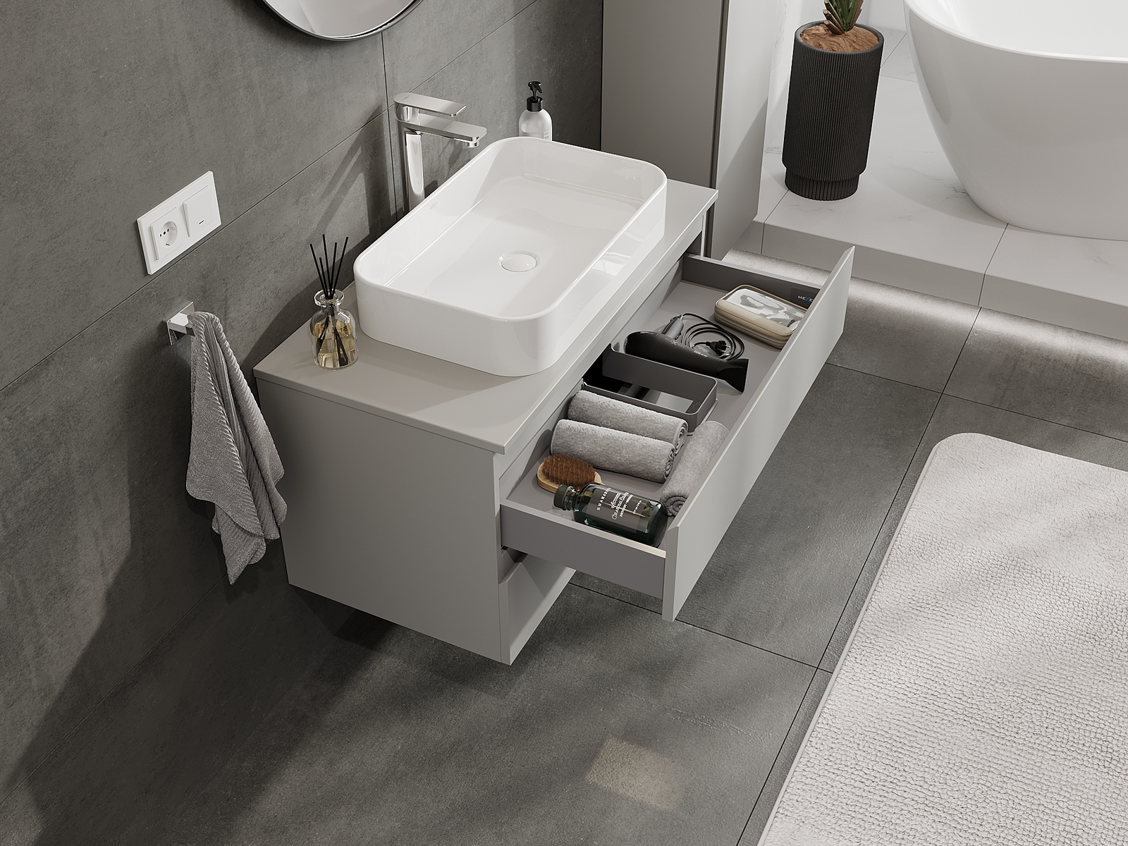 Utskärningen i lådan är utformad på ett sådant sätt att den rymmer vattenlåset som är nödvändigt i tvättställsinstallationer. Tack vare detta kan möbeln installeras fullt ut funktionellt, utan att behöva avstå från utrymme i lådan för installationen.
