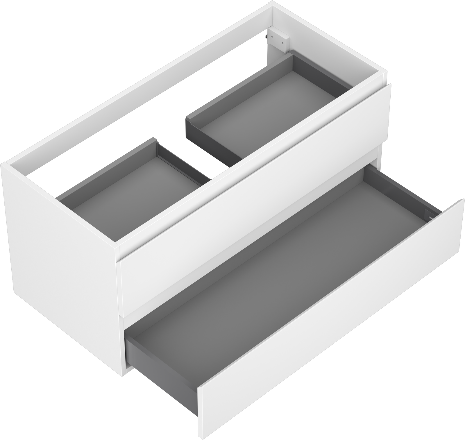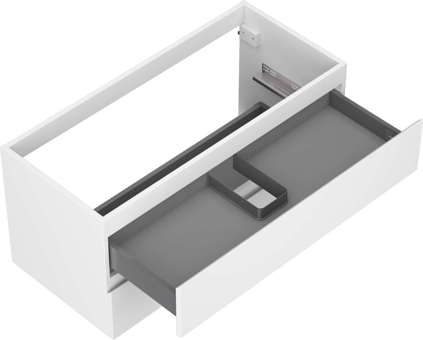 Utskärningen i lådan är utformad på ett sådant sätt att den rymmer vattenlåset som är nödvändigt i tvättställsinstallationer. Tack vare detta kan möbeln installeras fullt ut funktionellt, utan att behöva avstå från utrymme i lådan för installationen.