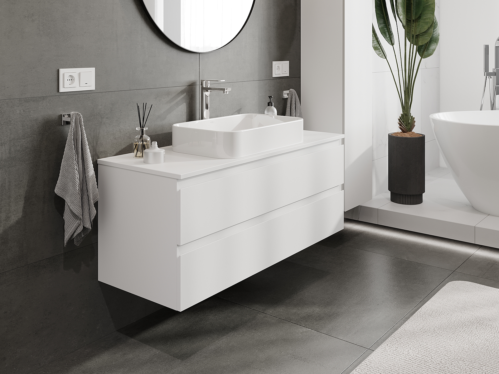Våra modulära badrumsmöbler kan kombineras i olika färgkonfigurationer, vilket möjliggör fullständig personalisering. Du kan välja både utseende och funktioner för respektive delar, vilket gör att möblerna kan anpassas till dina egna stilistiska och funktionella preferenser.