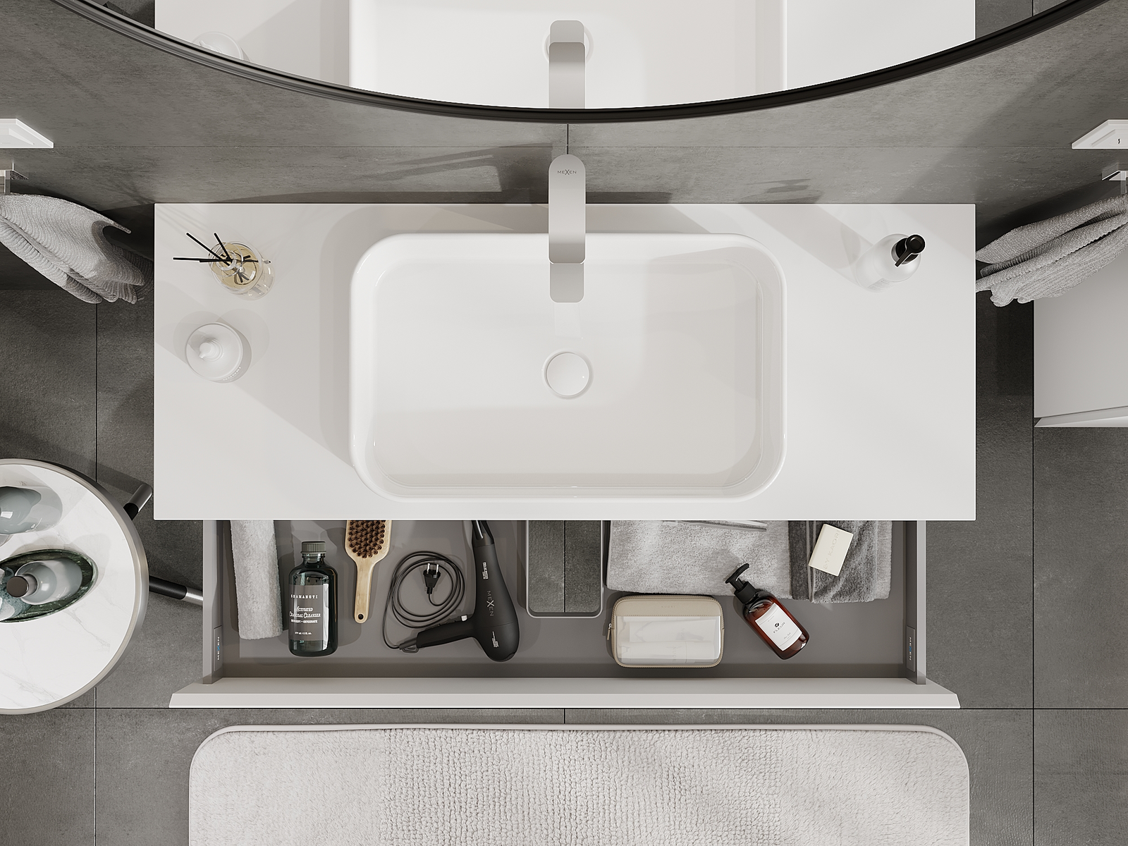 Utskärningen i lådan är utformad på ett sådant sätt att den rymmer vattenlåset som är nödvändigt i tvättställsinstallationer. Tack vare detta kan möbeln installeras fullt ut funktionellt, utan att behöva avstå från utrymme i lådan för installationen.
