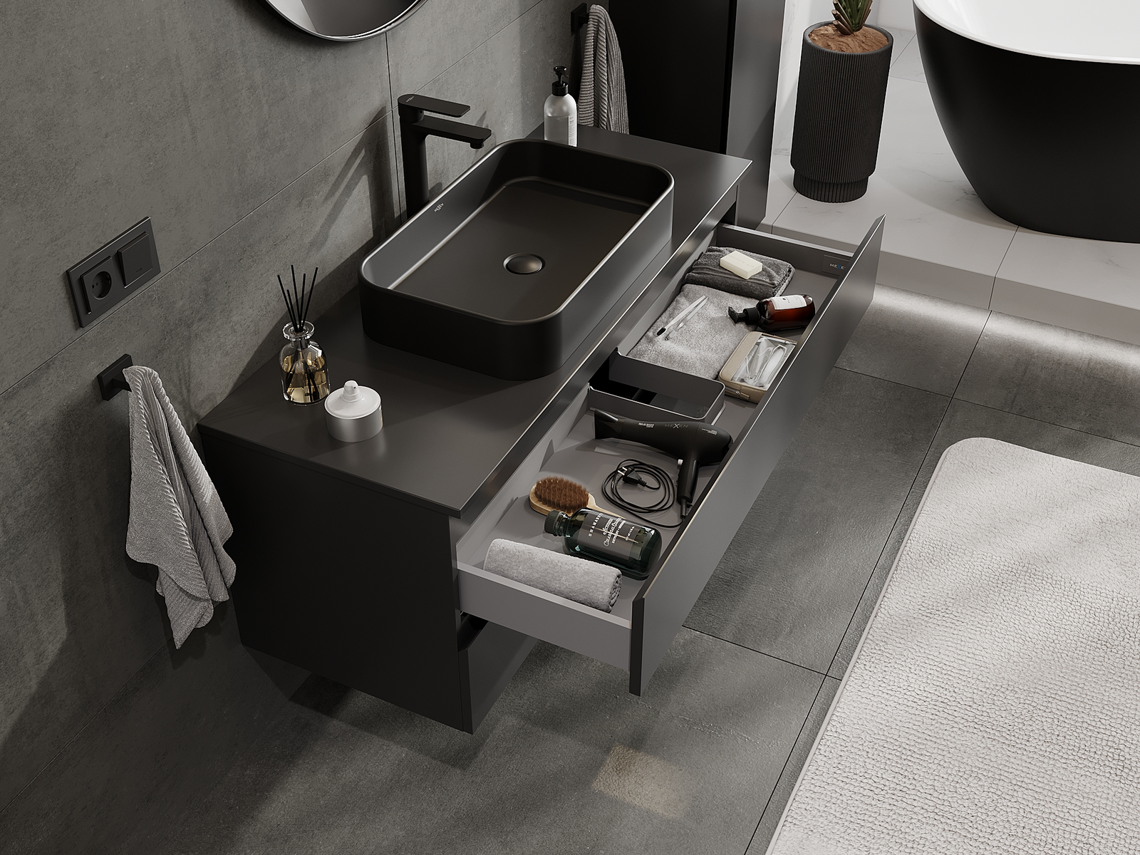 Utskärningen i lådan är utformad på ett sådant sätt att den rymmer vattenlåset som är nödvändigt i tvättställsinstallationer. Tack vare detta kan möbeln installeras fullt ut funktionellt, utan att behöva avstå från utrymme i lådan för installationen.