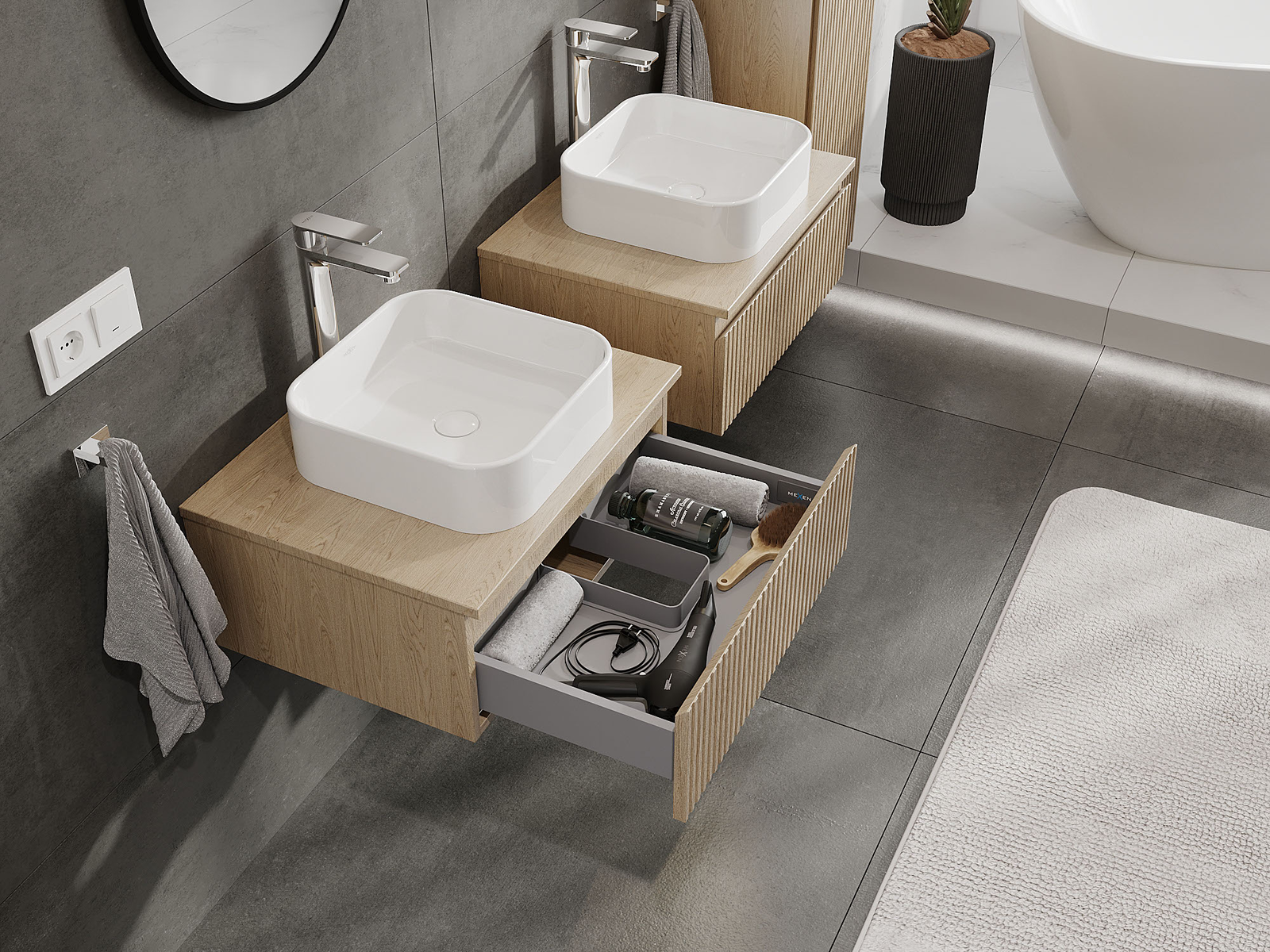 Utskärningen i lådan är utformad på ett sådant sätt att den rymmer vattenlåset som är nödvändigt i tvättställsinstallationer. Tack vare detta kan möbeln installeras fullt ut funktionellt, utan att behöva avstå från utrymme i lådan för installationen.