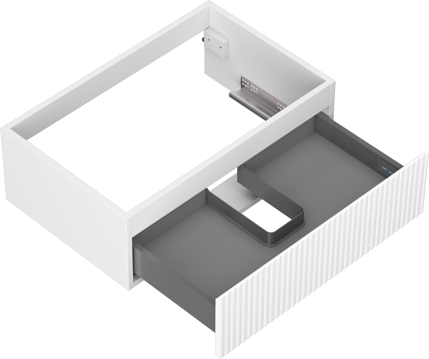 Utskärningen i lådan är utformad på ett sådant sätt att den rymmer vattenlåset som är nödvändigt i tvättställsinstallationer. Tack vare detta kan möbeln installeras fullt ut funktionellt, utan att behöva avstå från utrymme i lådan för installationen.