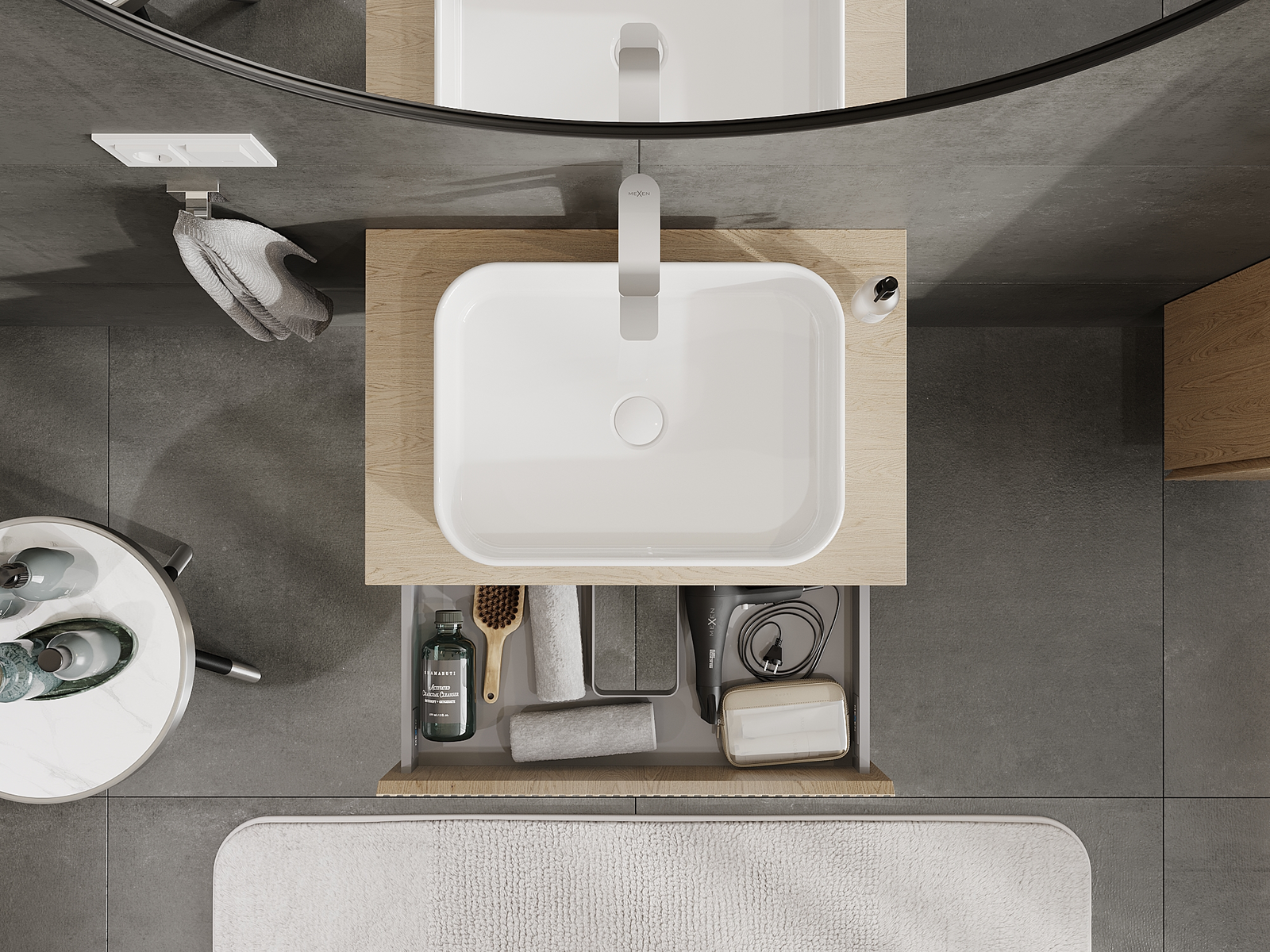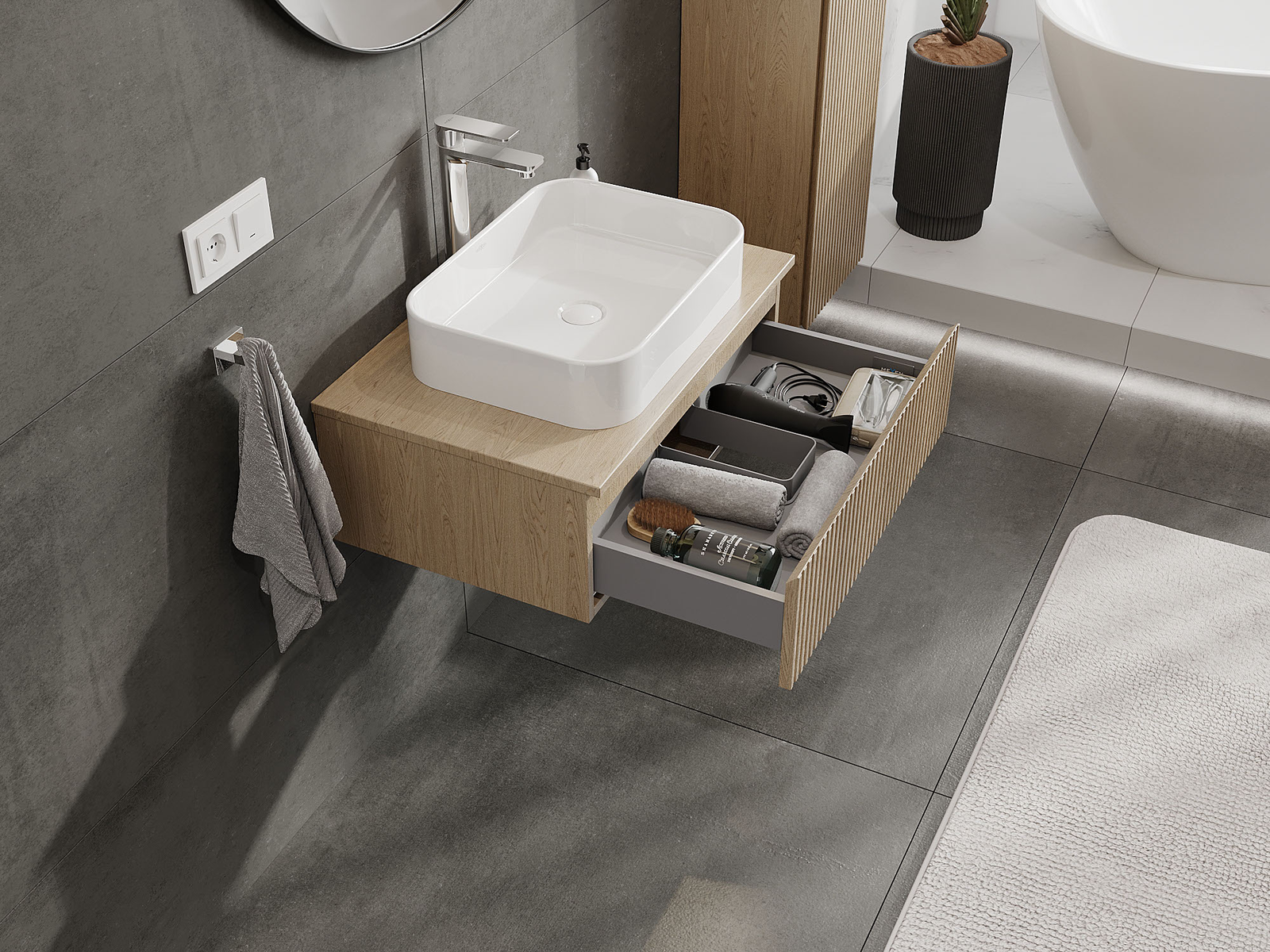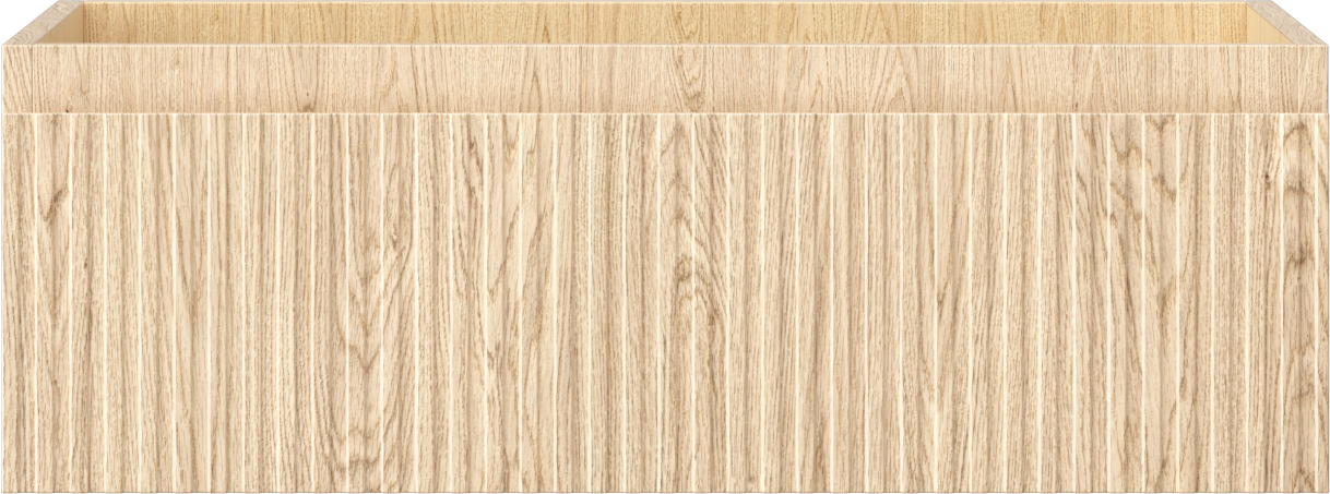 Utskärningen i lådan är utformad på ett sådant sätt att den rymmer vattenlåset som är nödvändigt i tvättställsinstallationer. Tack vare detta kan möbeln installeras fullt ut funktionellt, utan att behöva avstå från utrymme i lådan för installationen.