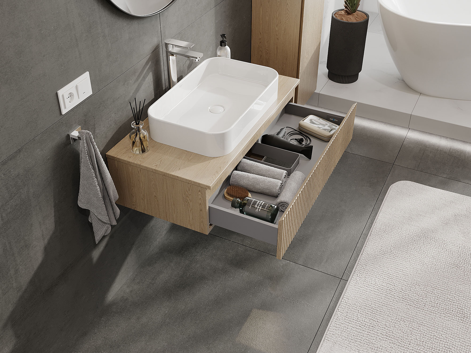 Utskärningen i lådan är utformad på ett sådant sätt att den rymmer vattenlåset som är nödvändigt i tvättställsinstallationer. Tack vare detta kan möbeln installeras fullt ut funktionellt, utan att behöva avstå från utrymme i lådan för installationen.
