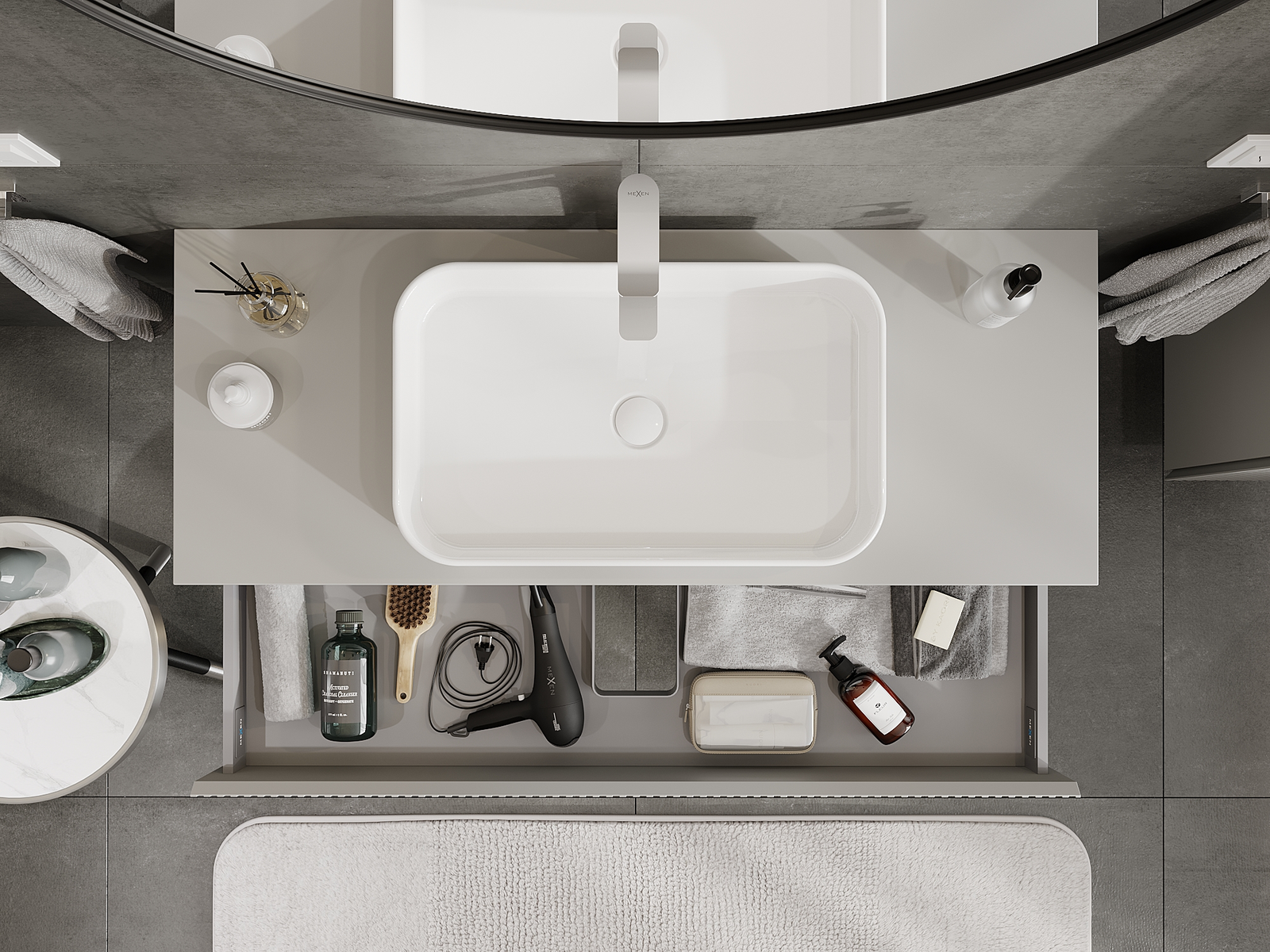 Utskärningen i lådan är utformad på ett sådant sätt att den rymmer vattenlåset som är nödvändigt i tvättställsinstallationer. Tack vare detta kan möbeln installeras fullt ut funktionellt, utan att behöva avstå från utrymme i lådan för installationen.