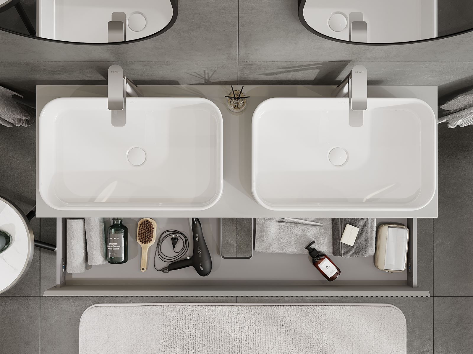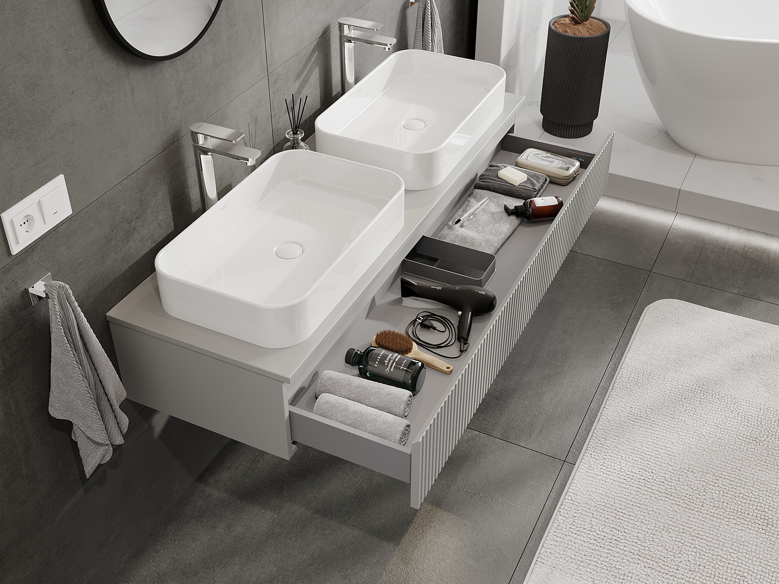 Utskärningen i lådan är utformad på ett sådant sätt att den rymmer vattenlåset som är nödvändigt i tvättställsinstallationer. Tack vare detta kan möbeln installeras fullt ut funktionellt, utan att behöva avstå från utrymme i lådan för installationen.