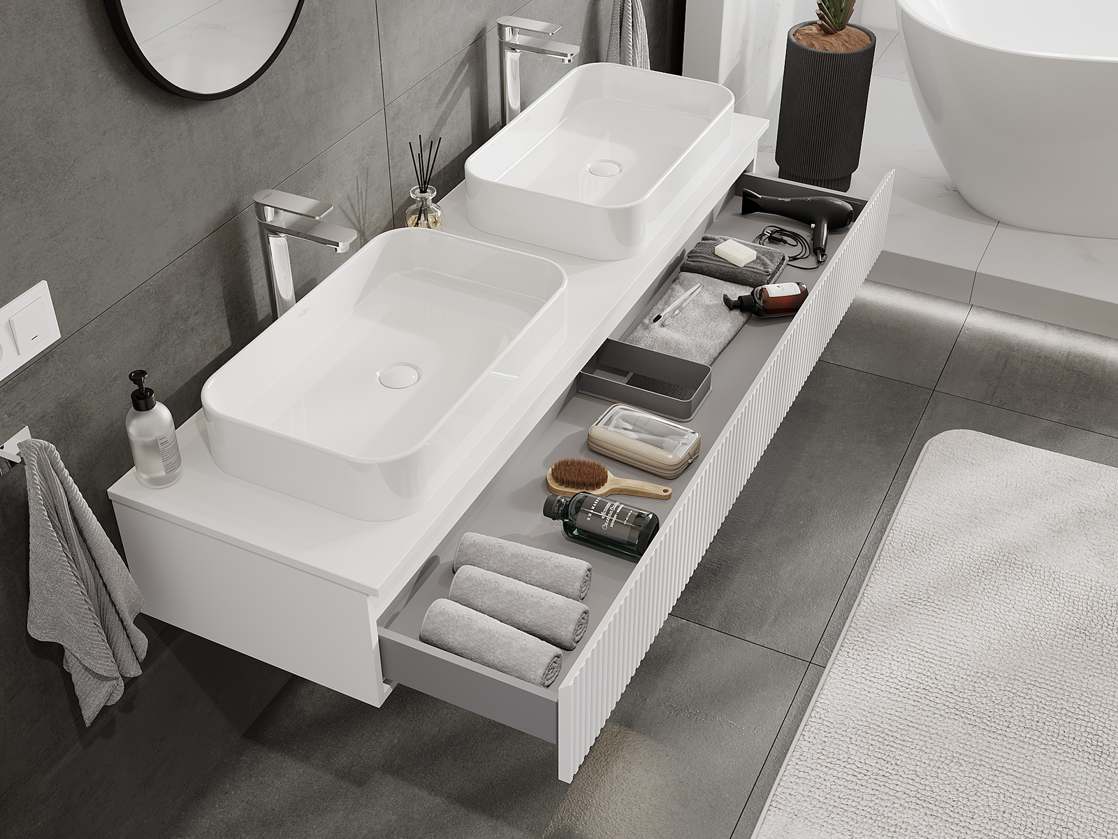 Våra modulära badrumsmöbler kan kombineras i olika färgkonfigurationer, vilket möjliggör fullständig personalisering. Du kan välja både utseende och funktioner för respektive delar, vilket gör att möblerna kan anpassas till dina egna stilistiska och funktionella preferenser.