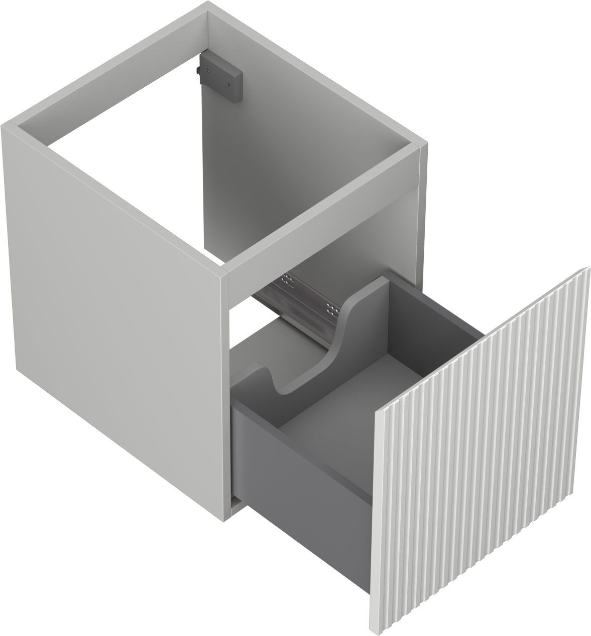 Utskärningen i lådan är utformad på ett sådant sätt att den rymmer vattenlåset som är nödvändigt i tvättställsinstallationer. Tack vare detta kan möbeln installeras fullt ut funktionellt, utan att behöva avstå från utrymme i lådan för installationen.
