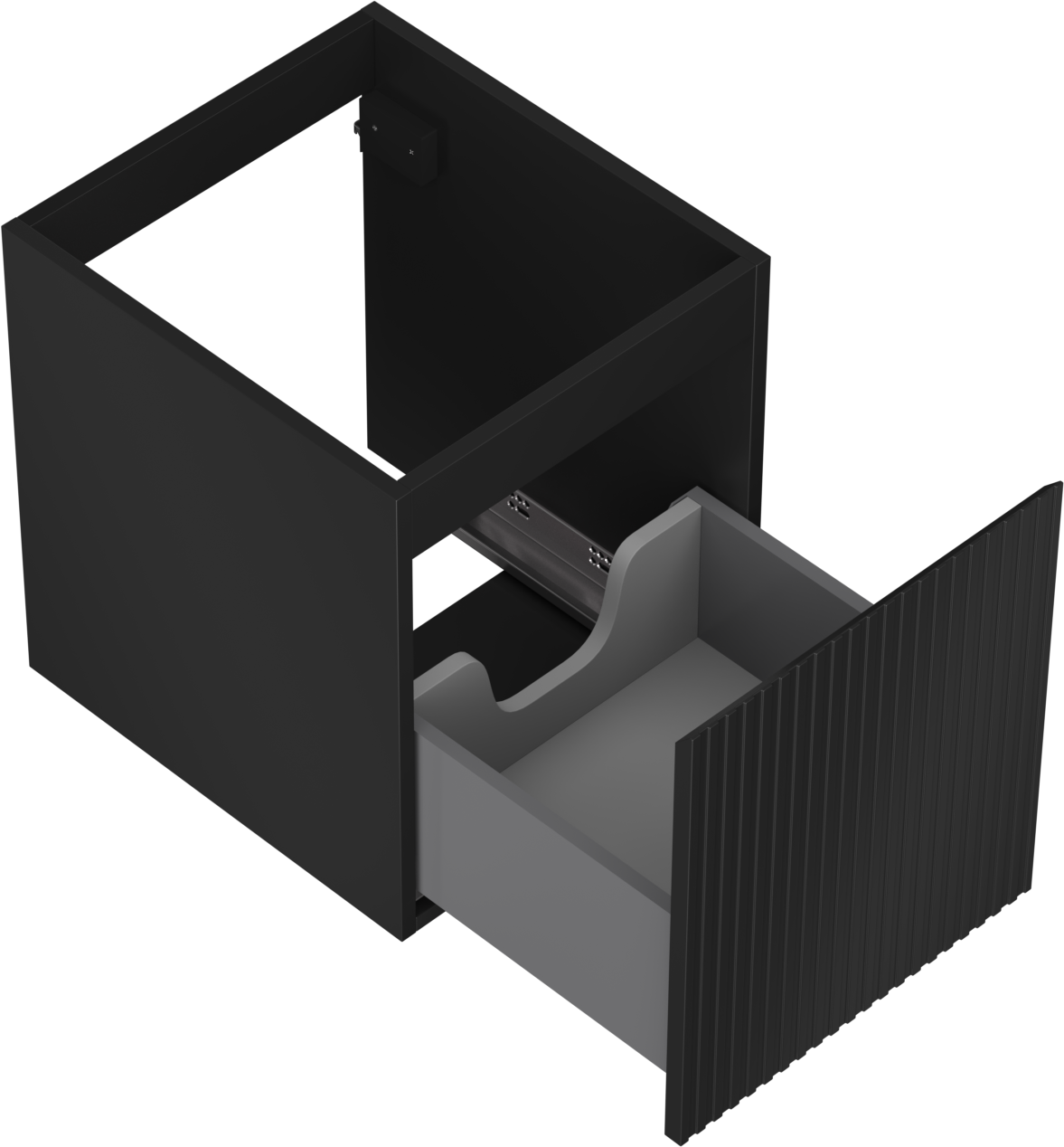 Utskärningen i lådan är utformad på ett sådant sätt att den rymmer vattenlåset som är nödvändigt i tvättställsinstallationer. Tack vare detta kan möbeln installeras fullt ut funktionellt, utan att behöva avstå från utrymme i lådan för installationen.