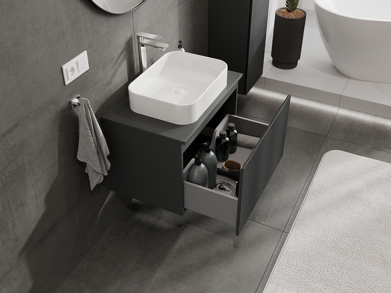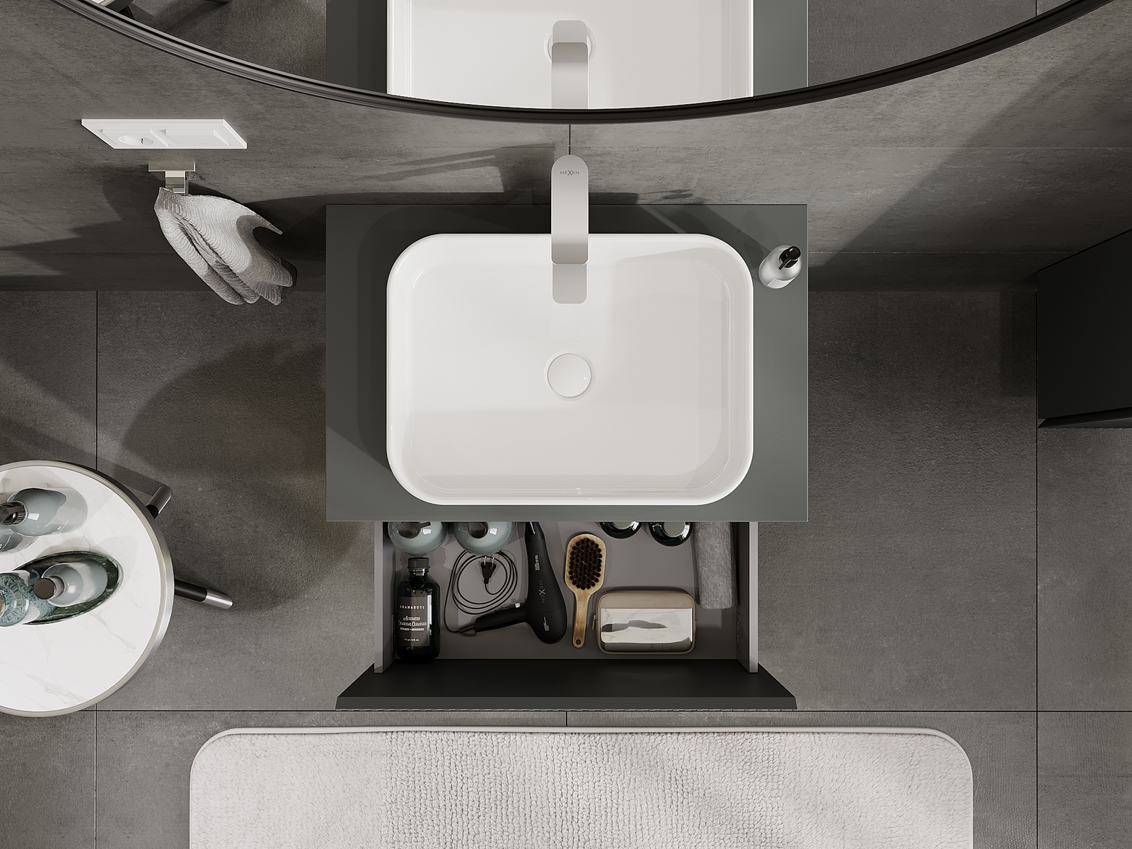 Utskärningen i lådan är utformad på ett sådant sätt att den rymmer vattenlåset som är nödvändigt i tvättställsinstallationer. Tack vare detta kan möbeln installeras fullt ut funktionellt, utan att behöva avstå från utrymme i lådan för installationen.