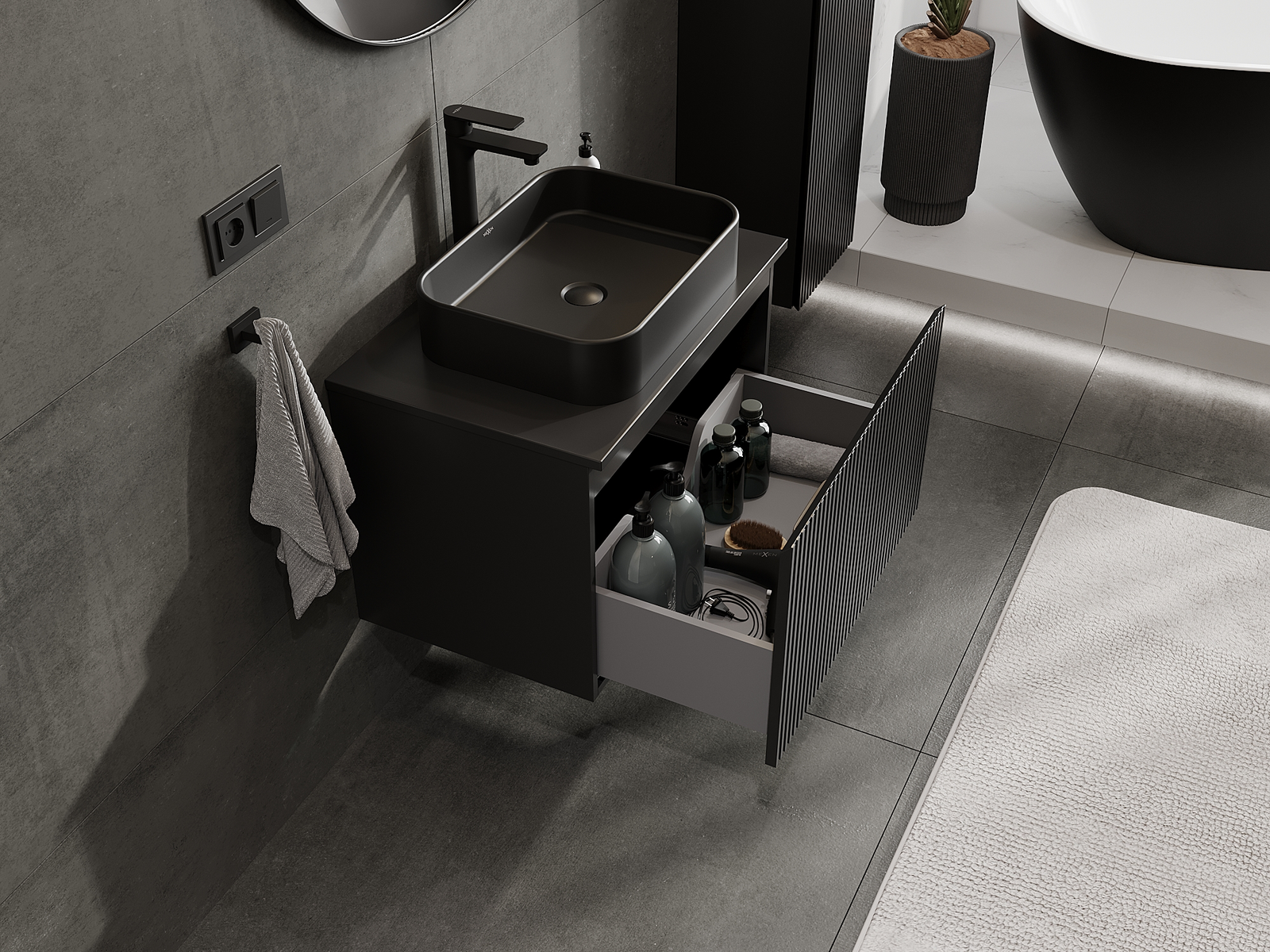 Utskärningen i lådan är utformad på ett sådant sätt att den rymmer vattenlåset som är nödvändigt i tvättställsinstallationer. Tack vare detta kan möbeln installeras fullt ut funktionellt, utan att behöva avstå från utrymme i lådan för installationen.