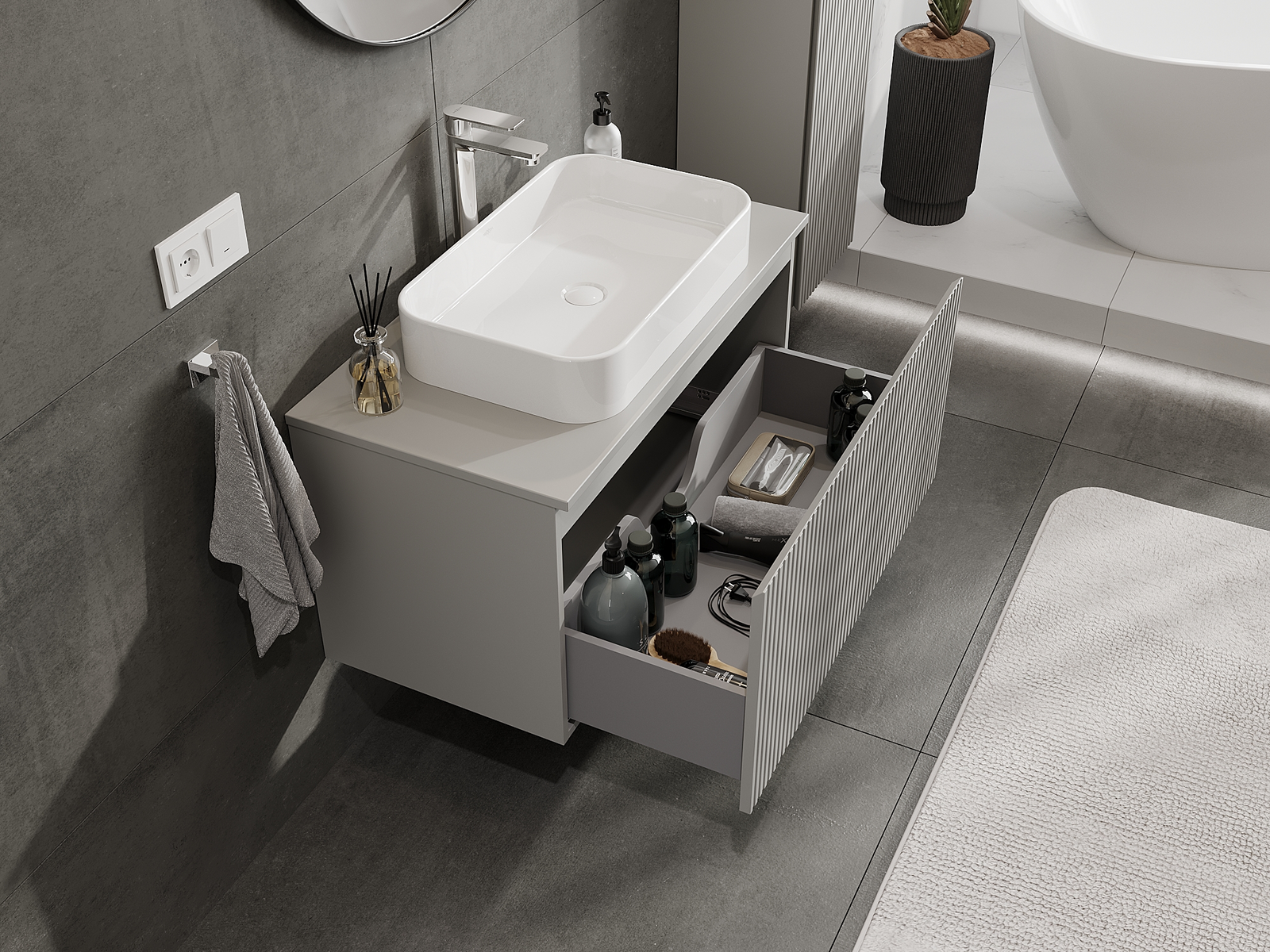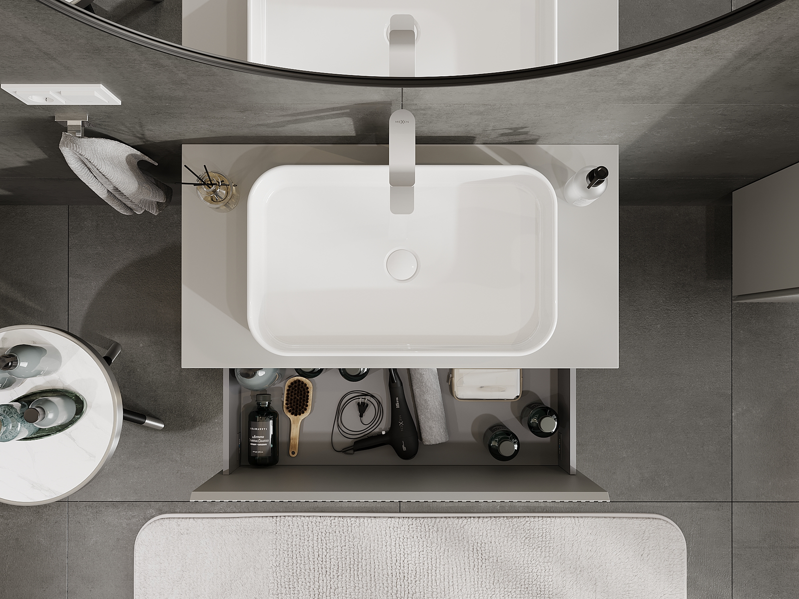 Utskärningen i lådan är utformad på ett sådant sätt att den rymmer vattenlåset som är nödvändigt i tvättställsinstallationer. Tack vare detta kan möbeln installeras fullt ut funktionellt, utan att behöva avstå från utrymme i lådan för installationen.