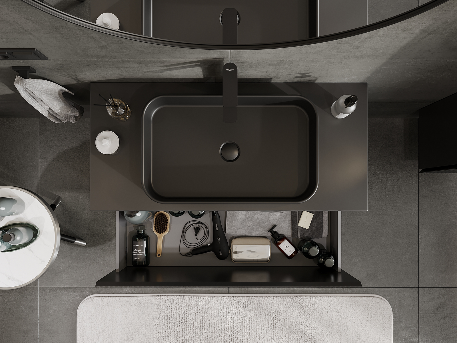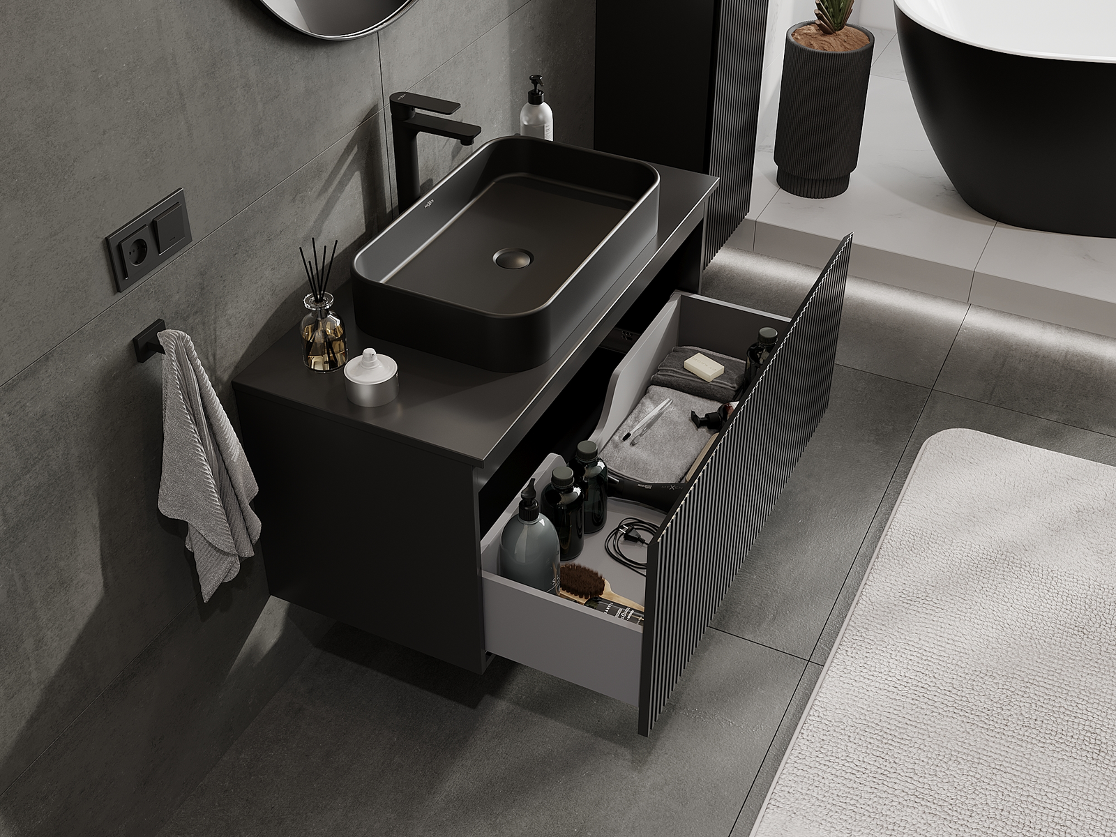 Utskärningen i lådan är utformad på ett sådant sätt att den rymmer vattenlåset som är nödvändigt i tvättställsinstallationer. Tack vare detta kan möbeln installeras fullt ut funktionellt, utan att behöva avstå från utrymme i lådan för installationen.