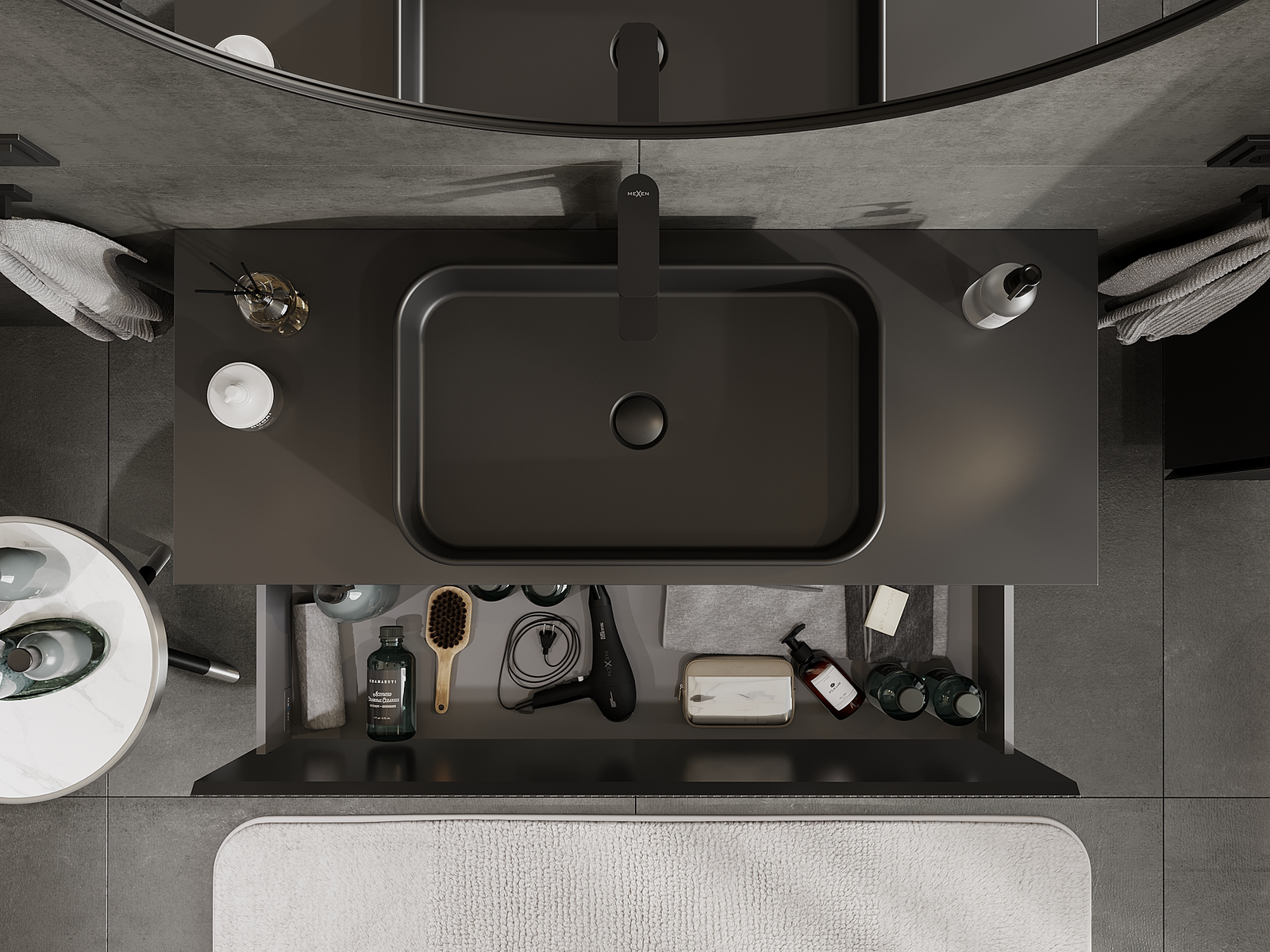 Utskärningen i lådan är utformad på ett sådant sätt att den rymmer vattenlåset som är nödvändigt i tvättställsinstallationer. Tack vare detta kan möbeln installeras fullt ut funktionellt, utan att behöva avstå från utrymme i lådan för installationen.