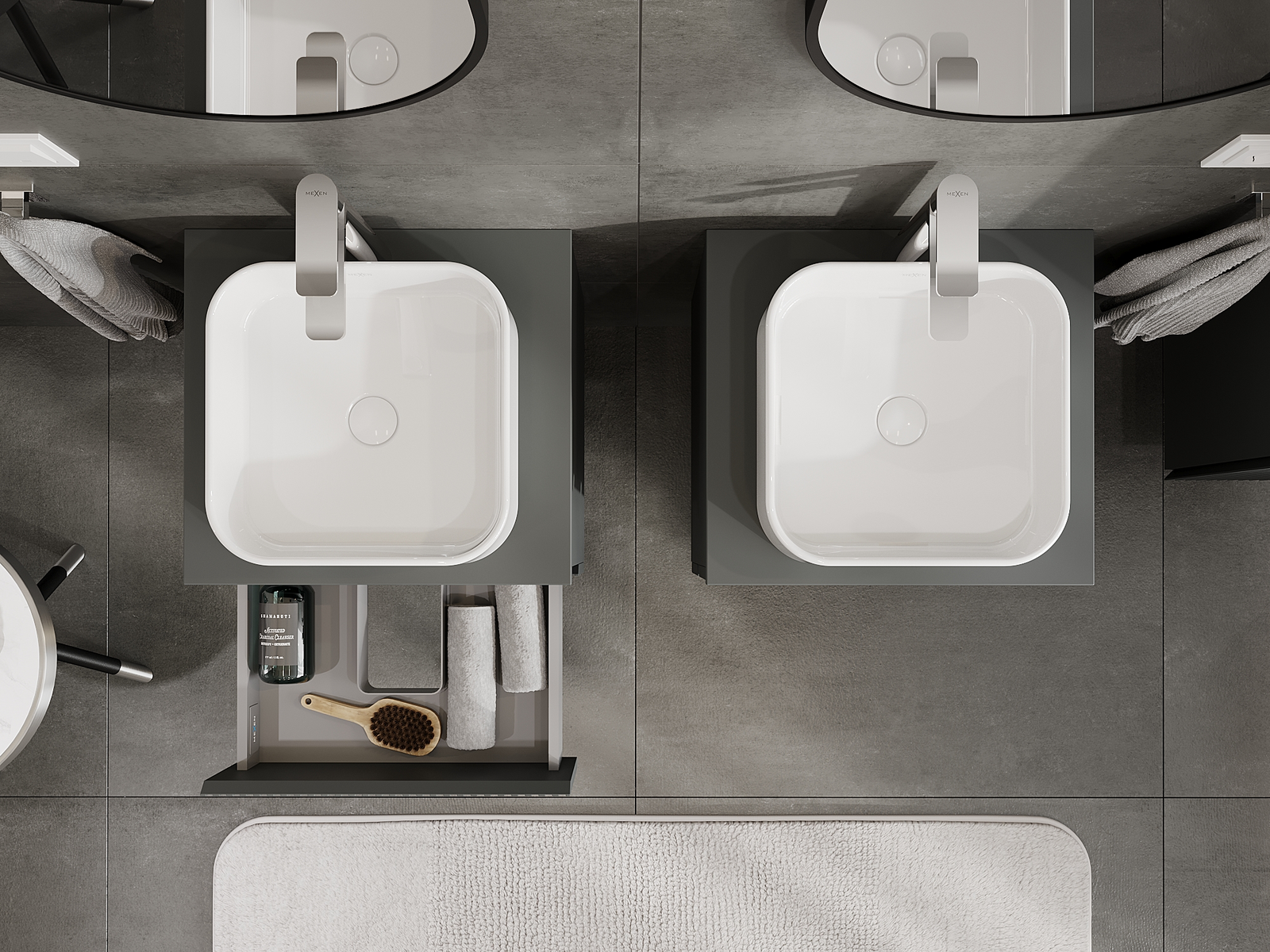 Utskärningen i lådan är utformad på ett sådant sätt att den rymmer vattenlåset som är nödvändigt i tvättställsinstallationer. Tack vare detta kan möbeln installeras fullt ut funktionellt, utan att behöva avstå från utrymme i lådan för installationen.