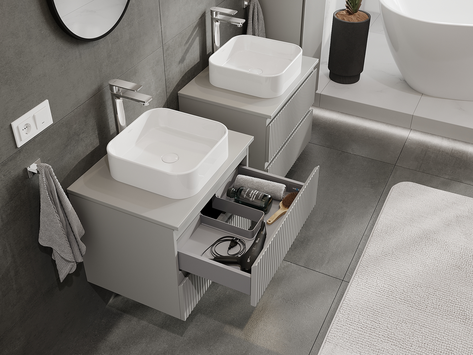 Våra modulära badrumsmöbler kan kombineras i olika färgkonfigurationer, vilket möjliggör fullständig personalisering. Du kan välja både utseende och funktioner för respektive delar, vilket gör att möblerna kan anpassas till dina egna stilistiska och funktionella preferenser.