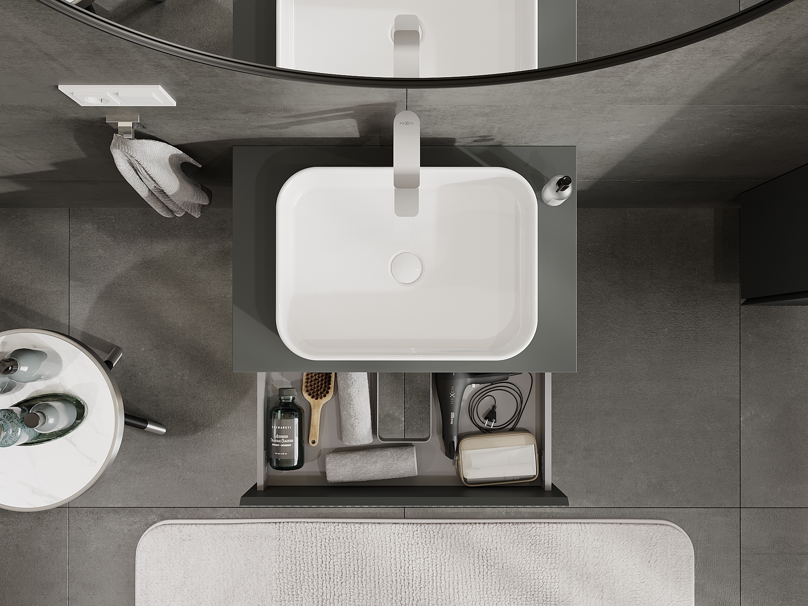 Utskärningen i lådan är utformad på ett sådant sätt att den rymmer vattenlåset som är nödvändigt i tvättställsinstallationer. Tack vare detta kan möbeln installeras fullt ut funktionellt, utan att behöva avstå från utrymme i lådan för installationen.