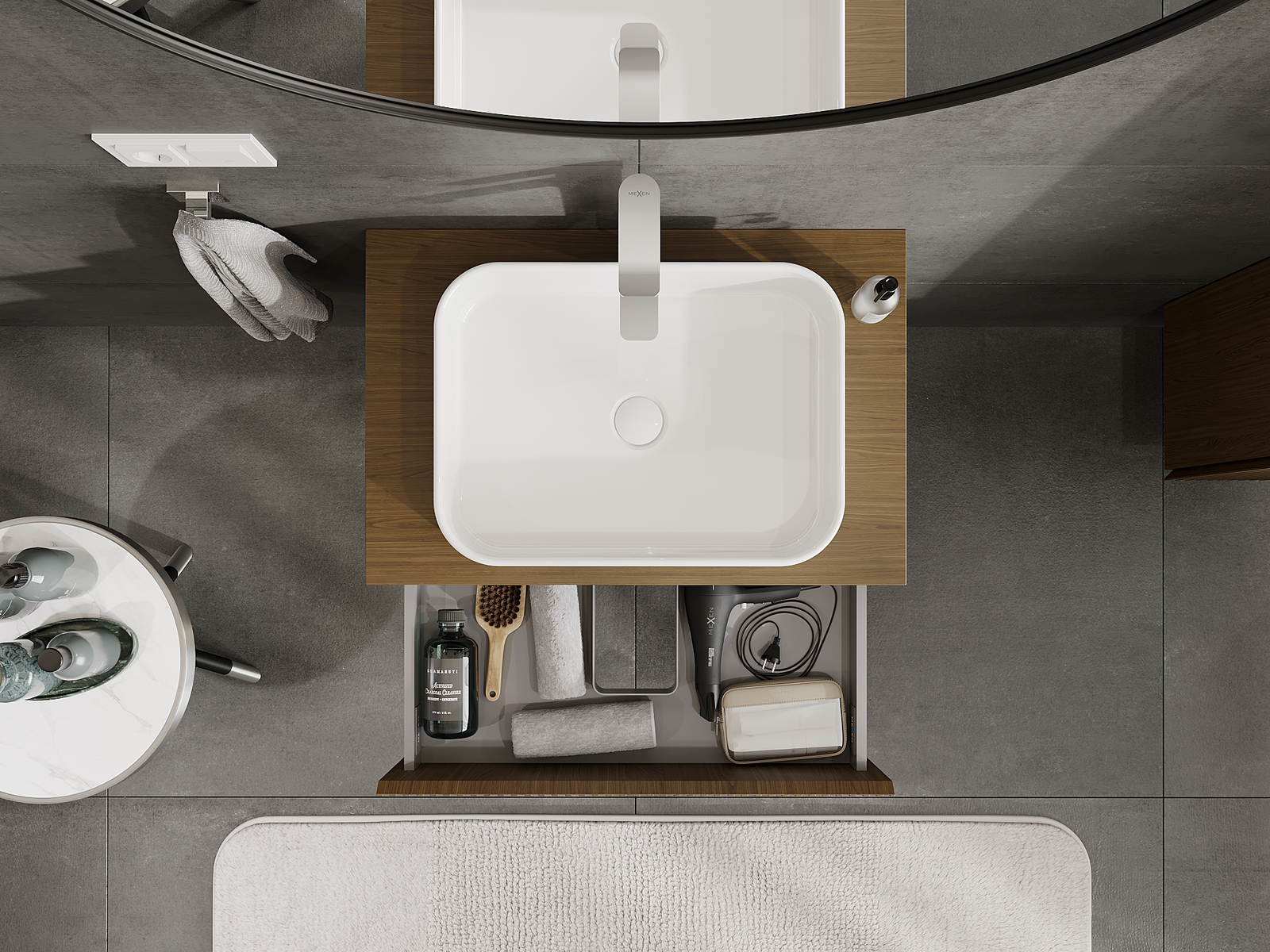 Utskärningen i lådan är utformad på ett sådant sätt att den rymmer vattenlåset som är nödvändigt i tvättställsinstallationer. Tack vare detta kan möbeln installeras fullt ut funktionellt, utan att behöva avstå från utrymme i lådan för installationen.