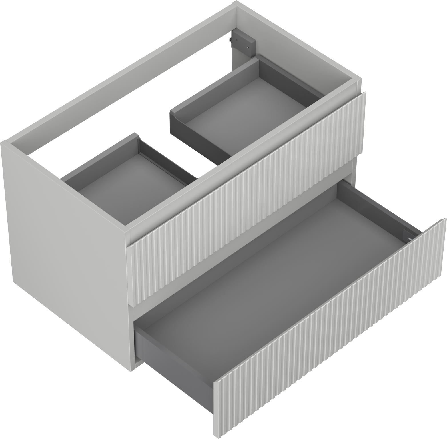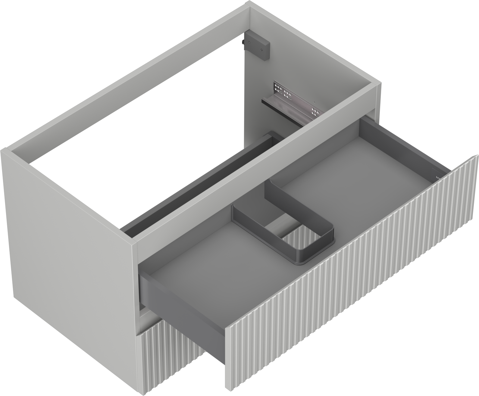 Utskärningen i lådan är utformad på ett sådant sätt att den rymmer vattenlåset som är nödvändigt i tvättställsinstallationer. Tack vare detta kan möbeln installeras fullt ut funktionellt, utan att behöva avstå från utrymme i lådan för installationen.