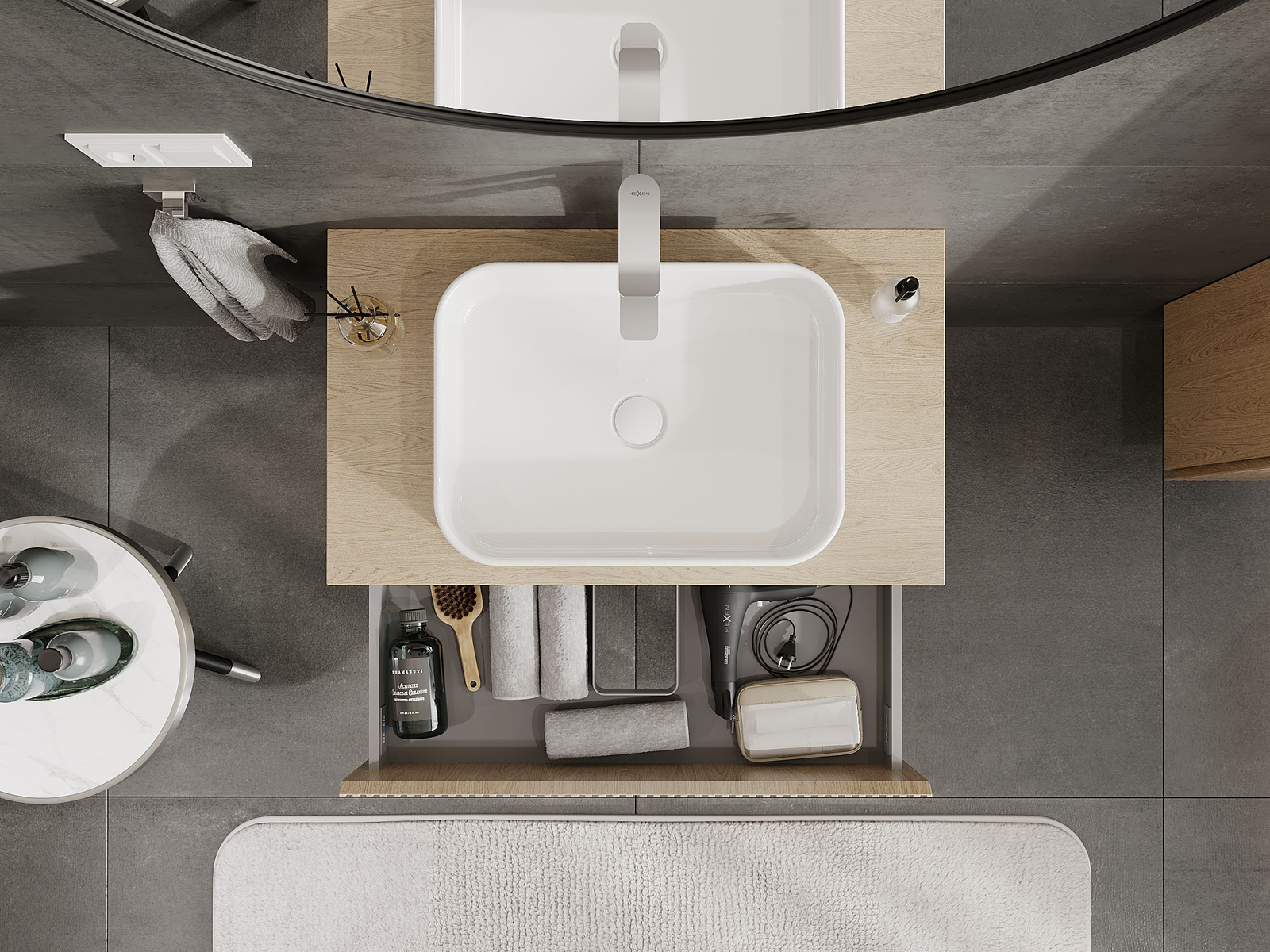 Utskärningen i lådan är utformad på ett sådant sätt att den rymmer vattenlåset som är nödvändigt i tvättställsinstallationer. Tack vare detta kan möbeln installeras fullt ut funktionellt, utan att behöva avstå från utrymme i lådan för installationen.