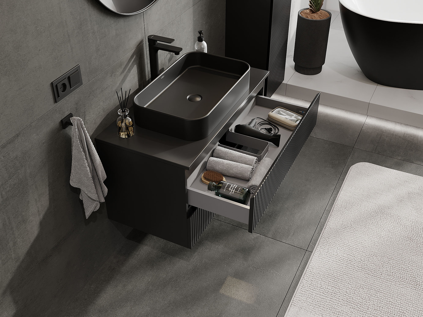 Utskärningen i lådan är utformad på ett sådant sätt att den rymmer vattenlåset som är nödvändigt i tvättställsinstallationer. Tack vare detta kan möbeln installeras fullt ut funktionellt, utan att behöva avstå från utrymme i lådan för installationen.
