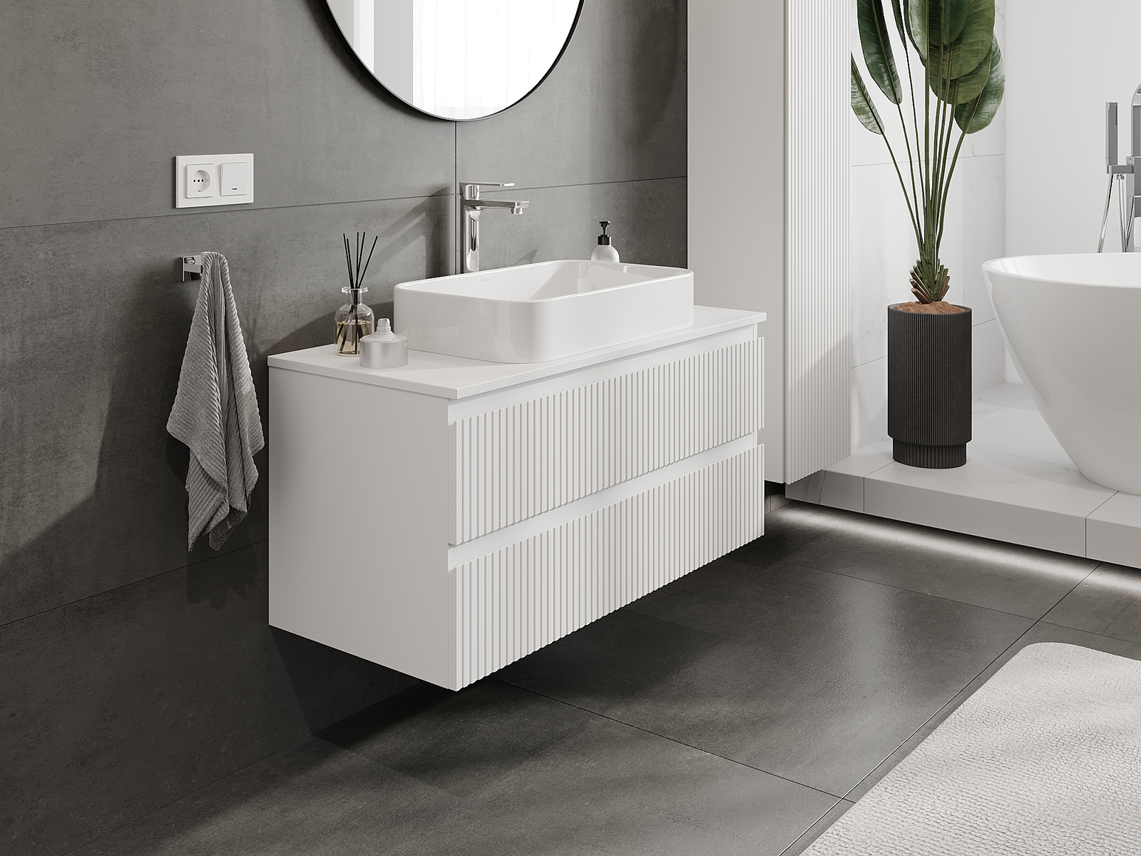 Utskärningen i lådan är utformad på ett sådant sätt att den rymmer vattenlåset som är nödvändigt i tvättställsinstallationer. Tack vare detta kan möbeln installeras fullt ut funktionellt, utan att behöva avstå från utrymme i lådan för installationen.