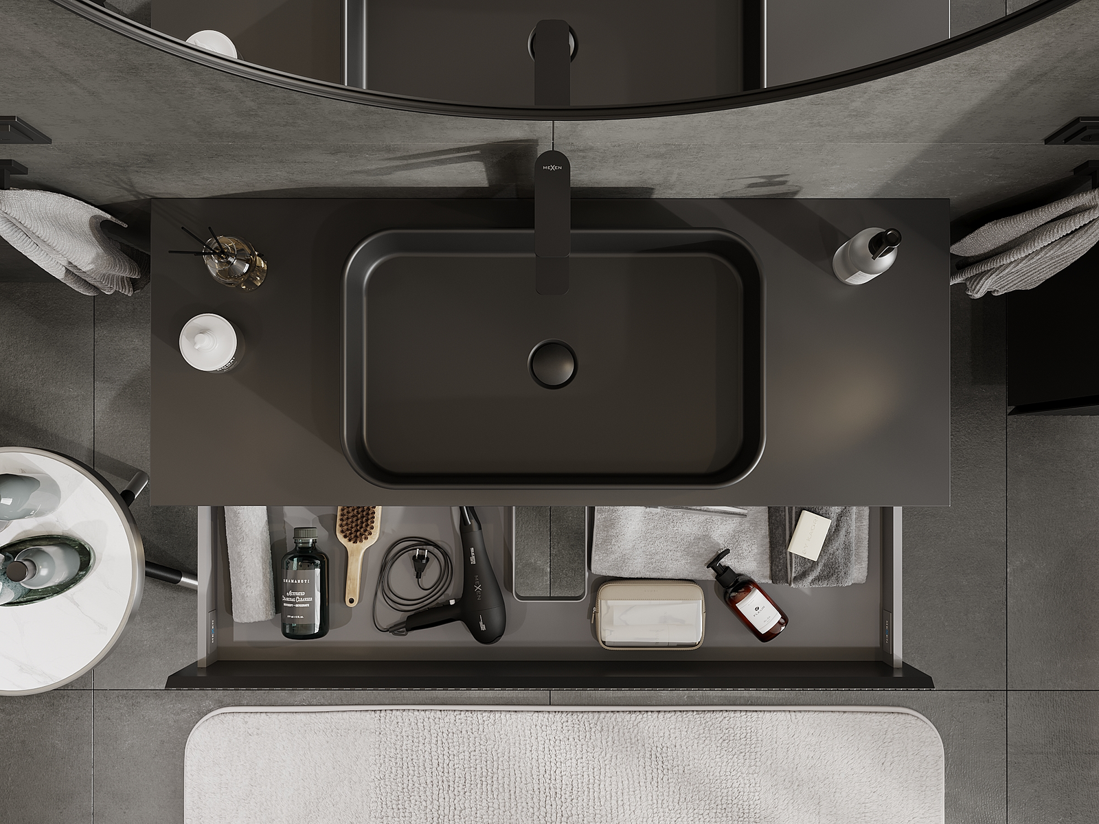 Utskärningen i lådan är utformad på ett sådant sätt att den rymmer vattenlåset som är nödvändigt i tvättställsinstallationer. Tack vare detta kan möbeln installeras fullt ut funktionellt, utan att behöva avstå från utrymme i lådan för installationen.
