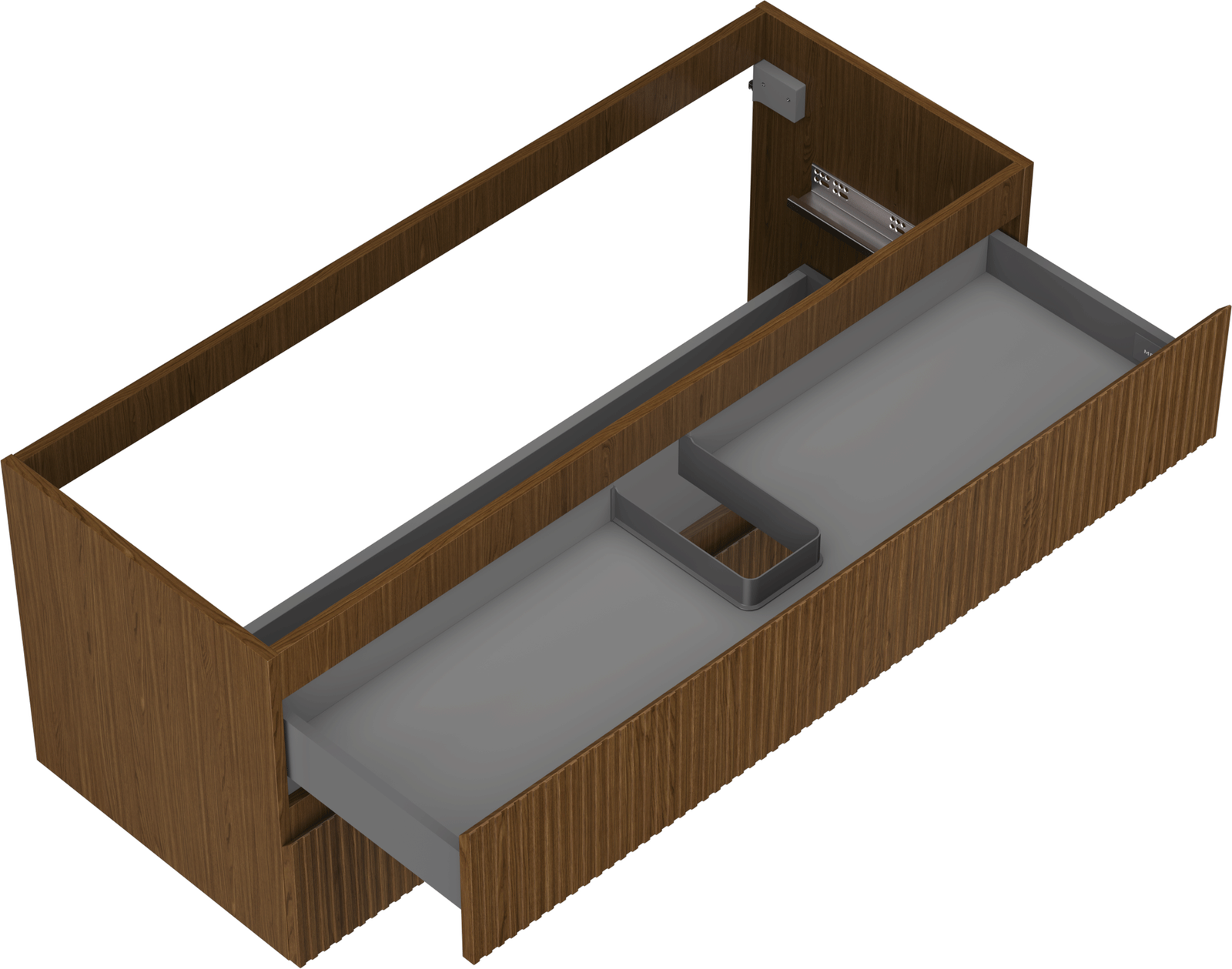 Utskärningen i lådan är utformad på ett sådant sätt att den rymmer vattenlåset som är nödvändigt i tvättställsinstallationer. Tack vare detta kan möbeln installeras fullt ut funktionellt, utan att behöva avstå från utrymme i lådan för installationen.