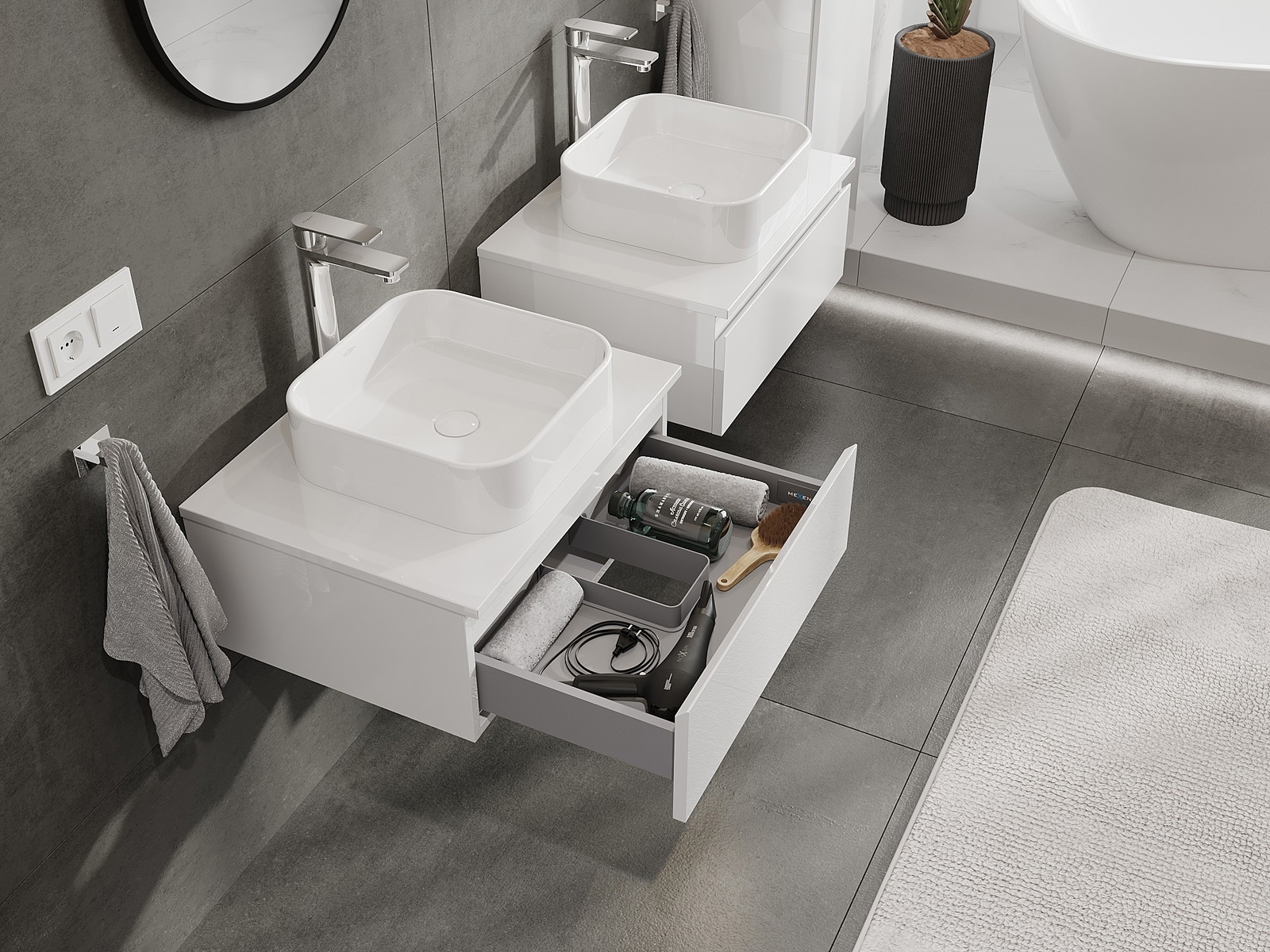 Våra modulära badrumsmöbler kan kombineras i olika färgkonfigurationer, vilket möjliggör fullständig personalisering. Du kan välja både utseende och funktioner för respektive delar, vilket gör att möblerna kan anpassas till dina egna stilistiska och funktionella preferenser.
