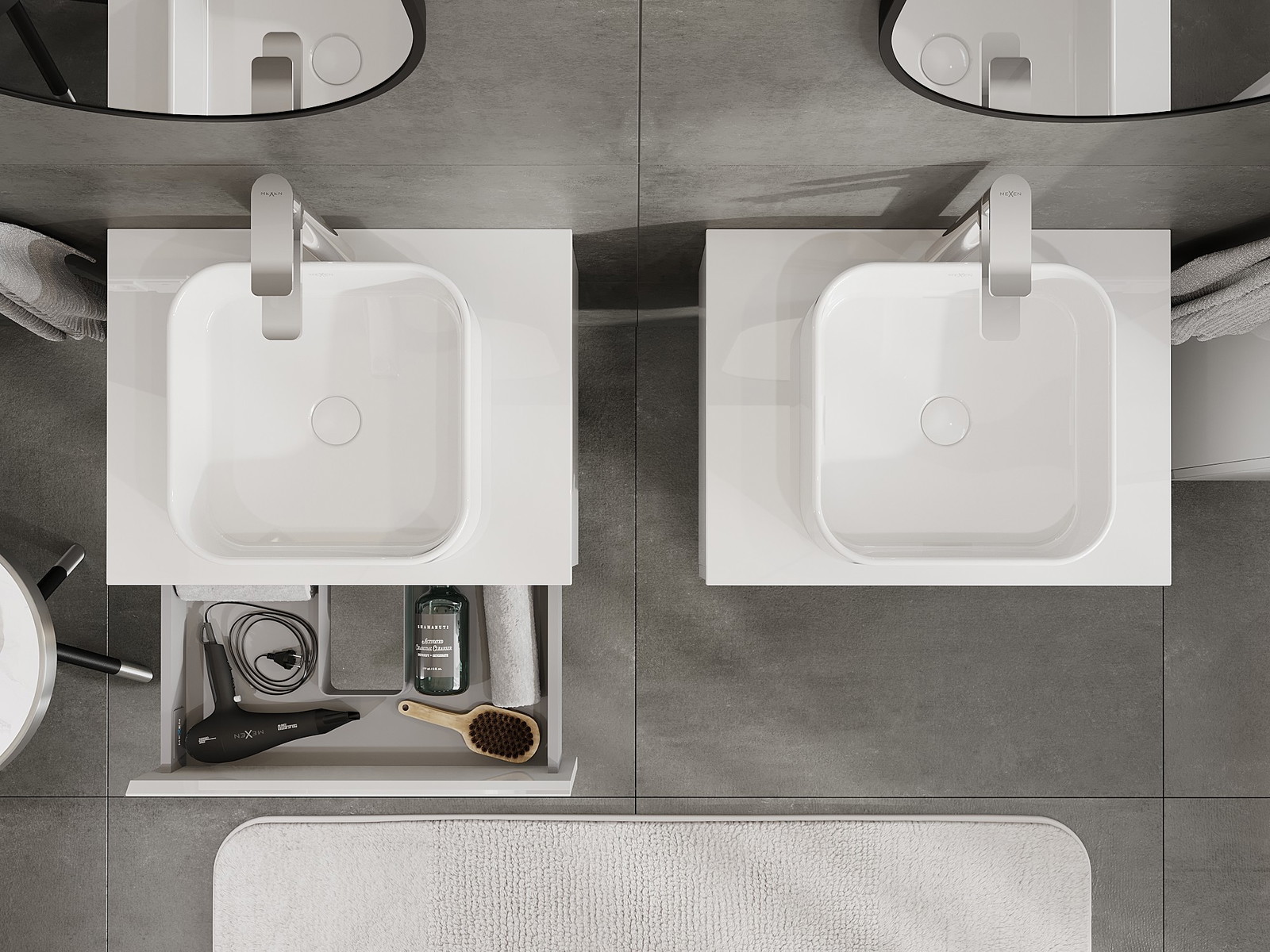 Utskärningen i lådan är utformad på ett sådant sätt att den rymmer vattenlåset som är nödvändigt i tvättställsinstallationer. Tack vare detta kan möbeln installeras fullt ut funktionellt, utan att behöva avstå från utrymme i lådan för installationen.