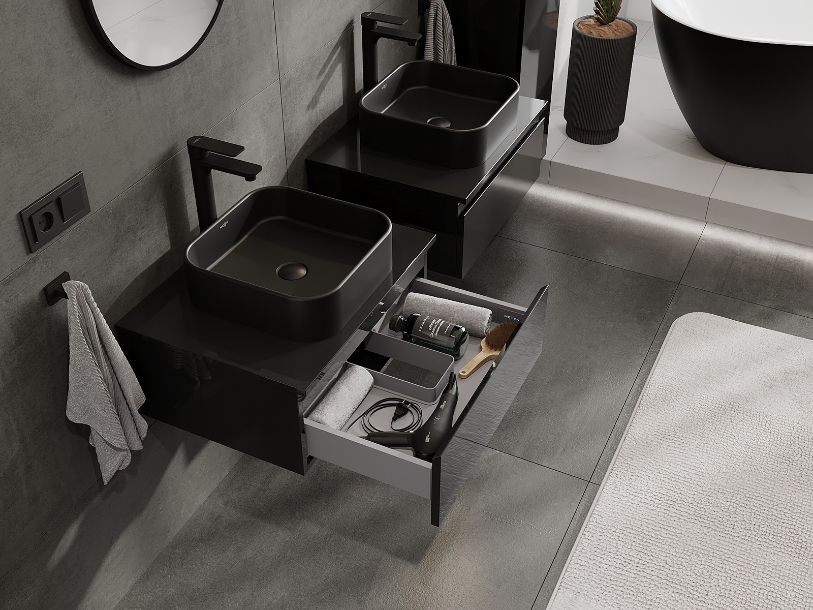 Våra modulära badrumsmöbler kan kombineras i olika färgkonfigurationer, vilket möjliggör fullständig personalisering. Du kan välja både utseende och funktioner för respektive delar, vilket gör att möblerna kan anpassas till dina egna stilistiska och funktionella preferenser.