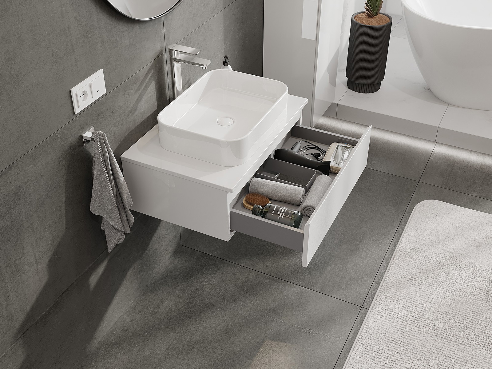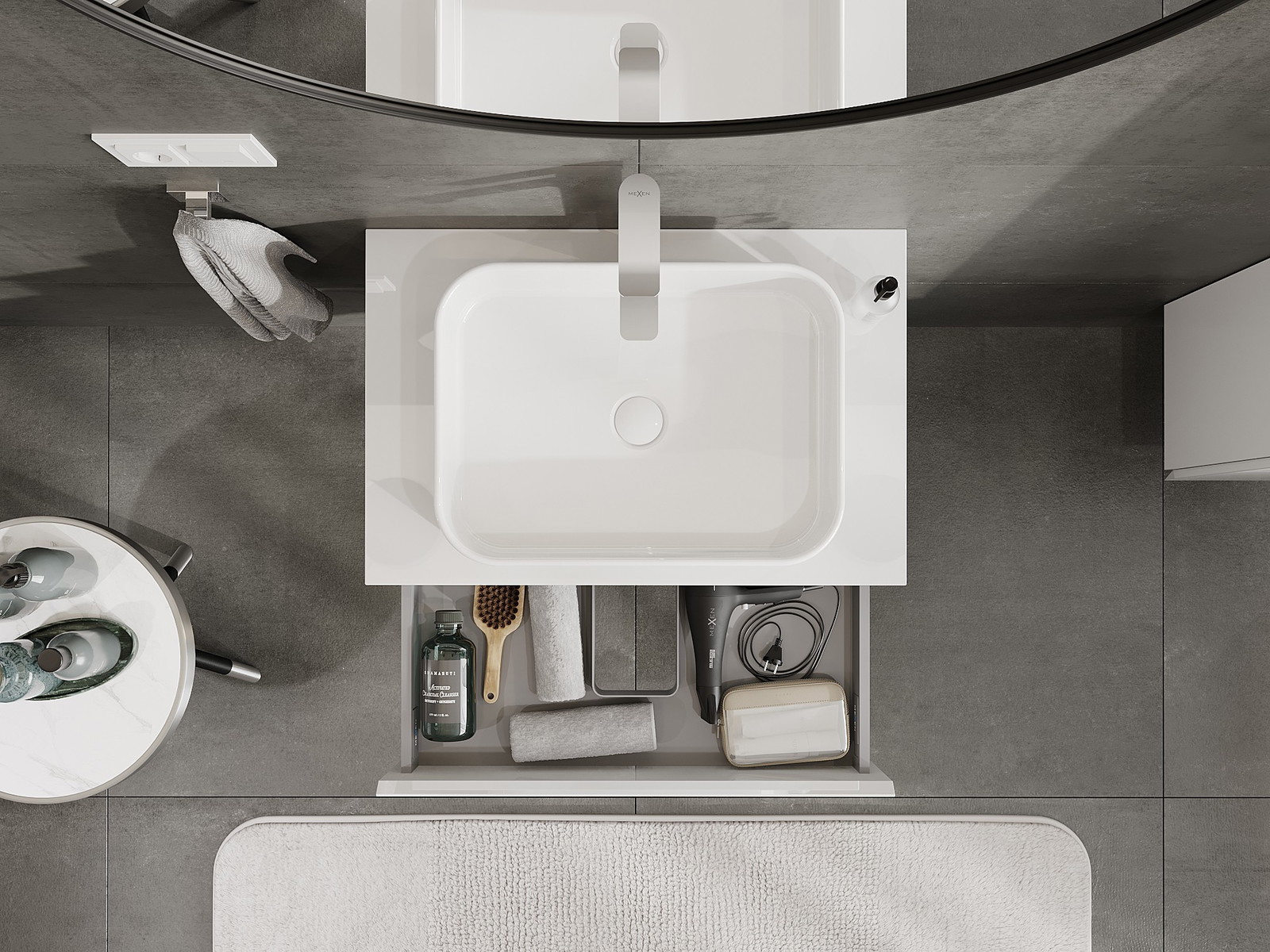 Utskärningen i lådan är utformad på ett sådant sätt att den rymmer vattenlåset som är nödvändigt i tvättställsinstallationer. Tack vare detta kan möbeln installeras fullt ut funktionellt, utan att behöva avstå från utrymme i lådan för installationen.