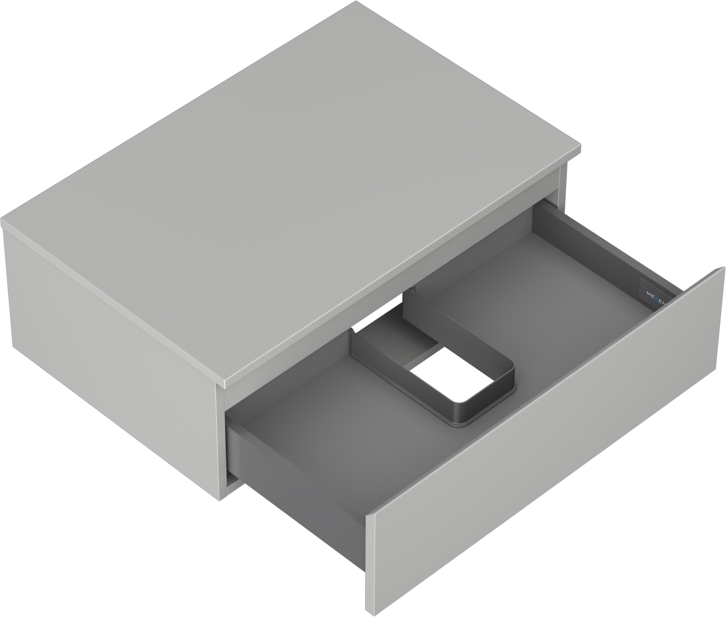 Utskärningen i lådan är utformad på ett sådant sätt att den rymmer vattenlåset som är nödvändigt i tvättställsinstallationer. Tack vare detta kan möbeln installeras fullt ut funktionellt, utan att behöva avstå från utrymme i lådan för installationen.