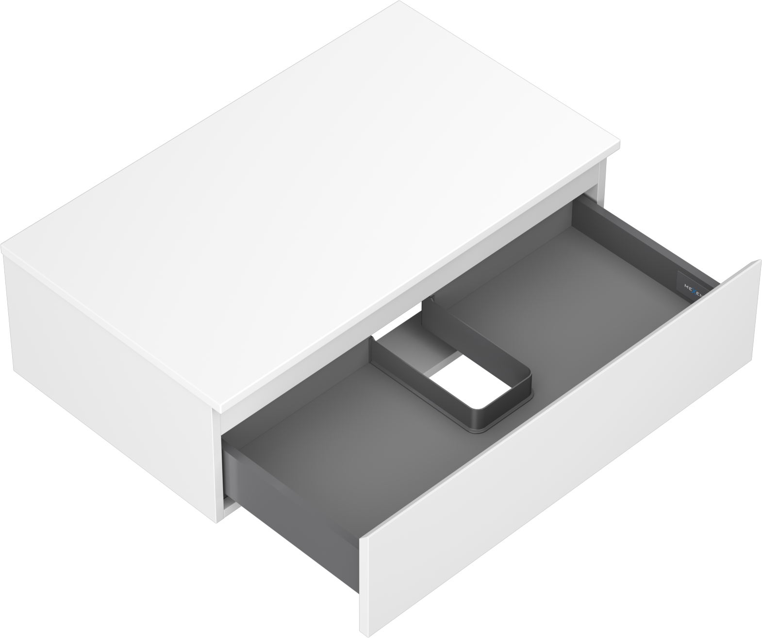 Utskärningen i lådan är utformad på ett sådant sätt att den rymmer vattenlåset som är nödvändigt i tvättställsinstallationer. Tack vare detta kan möbeln installeras fullt ut funktionellt, utan att behöva avstå från utrymme i lådan för installationen.