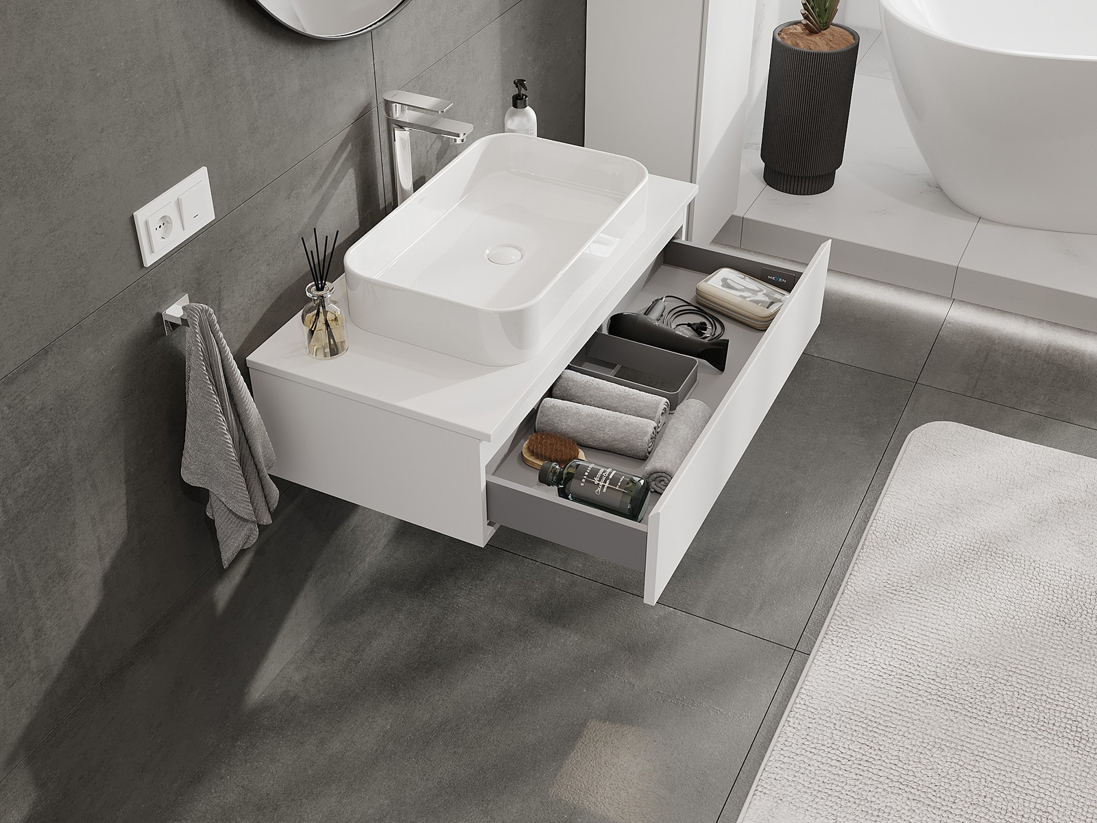 Utskärningen i lådan är utformad på ett sådant sätt att den rymmer vattenlåset som är nödvändigt i tvättställsinstallationer. Tack vare detta kan möbeln installeras fullt ut funktionellt, utan att behöva avstå från utrymme i lådan för installationen.
