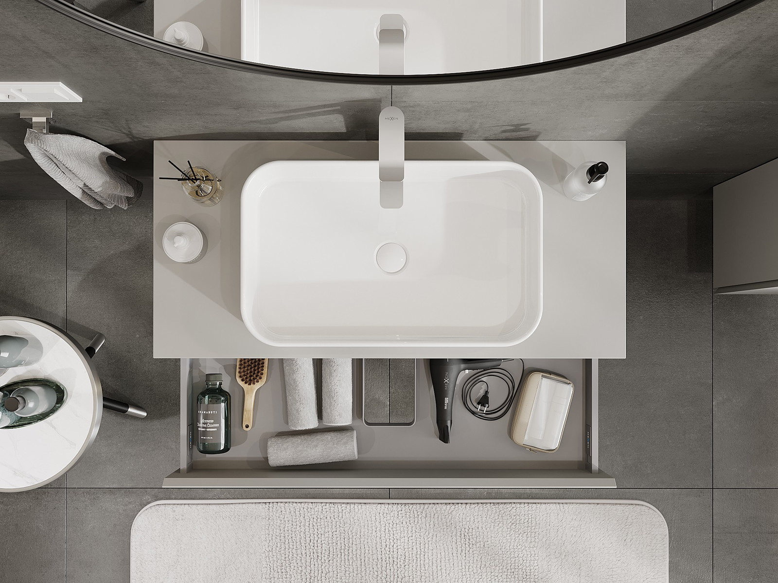 Utskärningen i lådan är utformad på ett sådant sätt att den rymmer vattenlåset som är nödvändigt i tvättställsinstallationer. Tack vare detta kan möbeln installeras fullt ut funktionellt, utan att behöva avstå från utrymme i lådan för installationen.