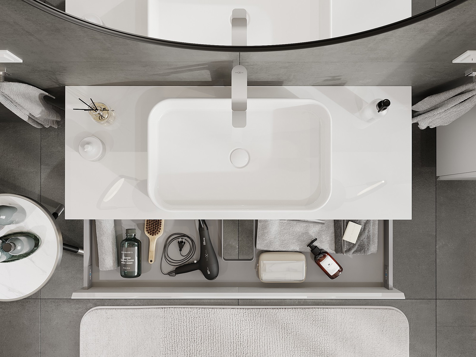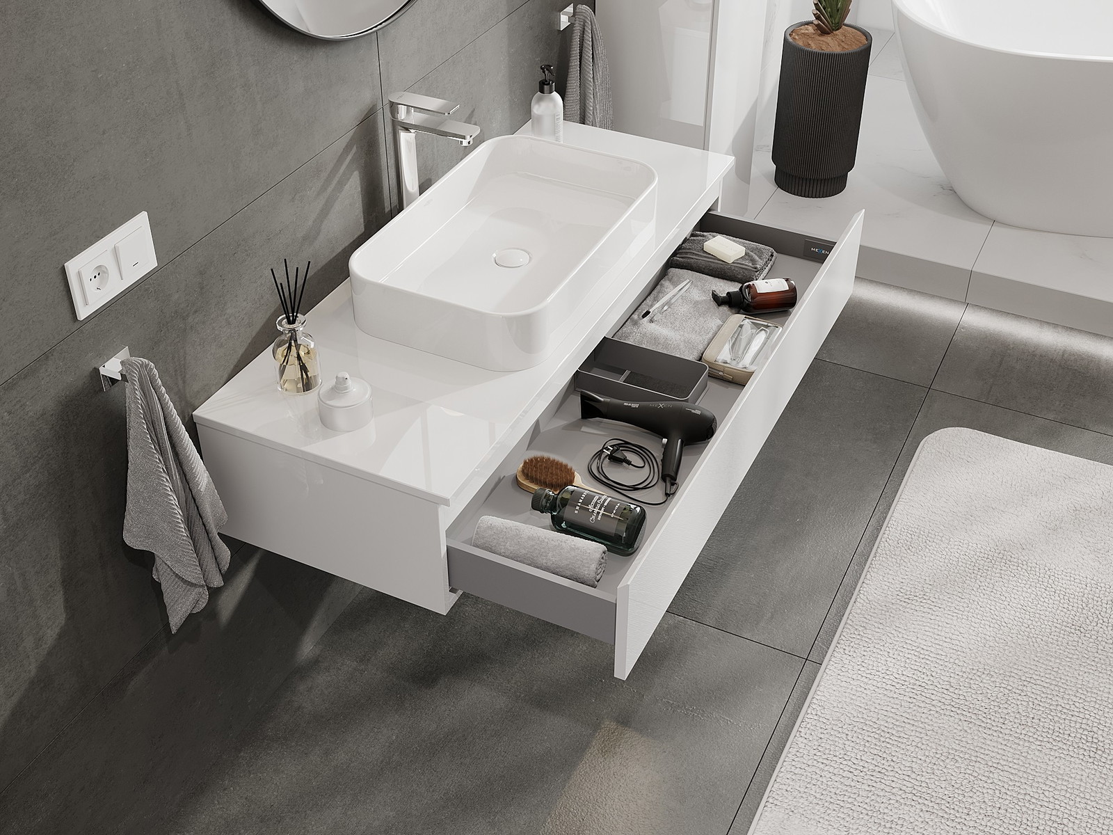 Utskärningen i lådan är utformad på ett sådant sätt att den rymmer vattenlåset som är nödvändigt i tvättställsinstallationer. Tack vare detta kan möbeln installeras fullt ut funktionellt, utan att behöva avstå från utrymme i lådan för installationen.