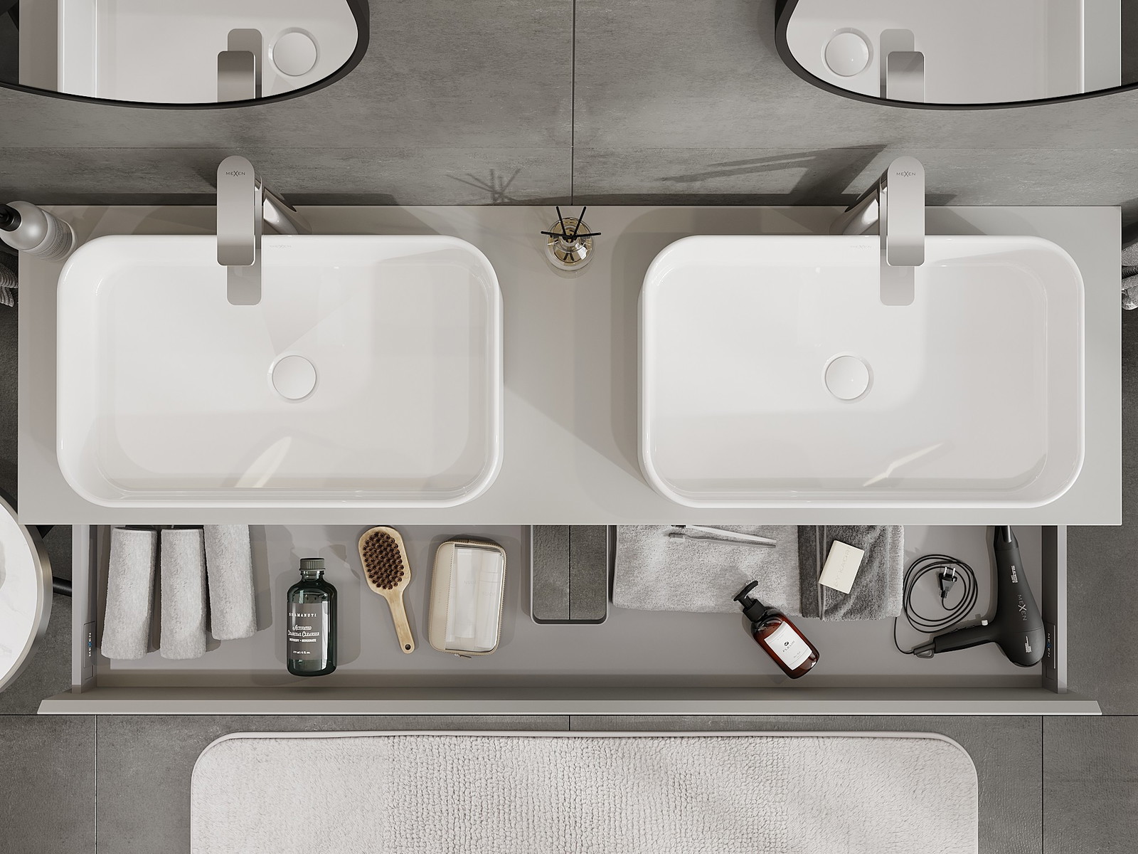 Utskärningen i lådan är utformad på ett sådant sätt att den rymmer vattenlåset som är nödvändigt i tvättställsinstallationer. Tack vare detta kan möbeln installeras fullt ut funktionellt, utan att behöva avstå från utrymme i lådan för installationen.