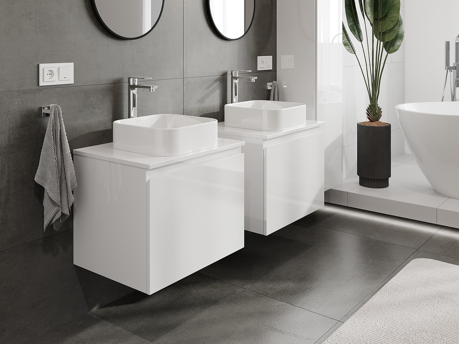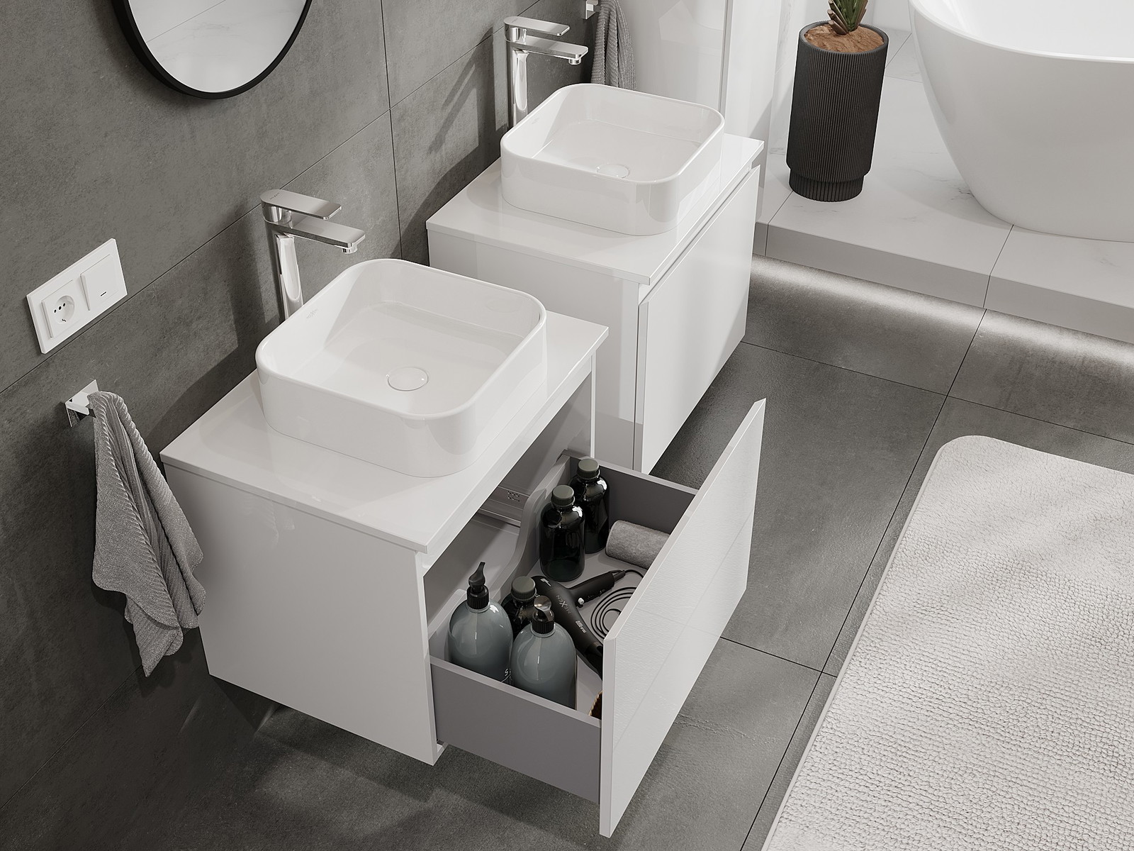 Våra modulära badrumsmöbler kan kombineras i olika färgkonfigurationer, vilket möjliggör fullständig personalisering. Du kan välja både utseende och funktioner för respektive delar, vilket gör att möblerna kan anpassas till dina egna stilistiska och funktionella preferenser.