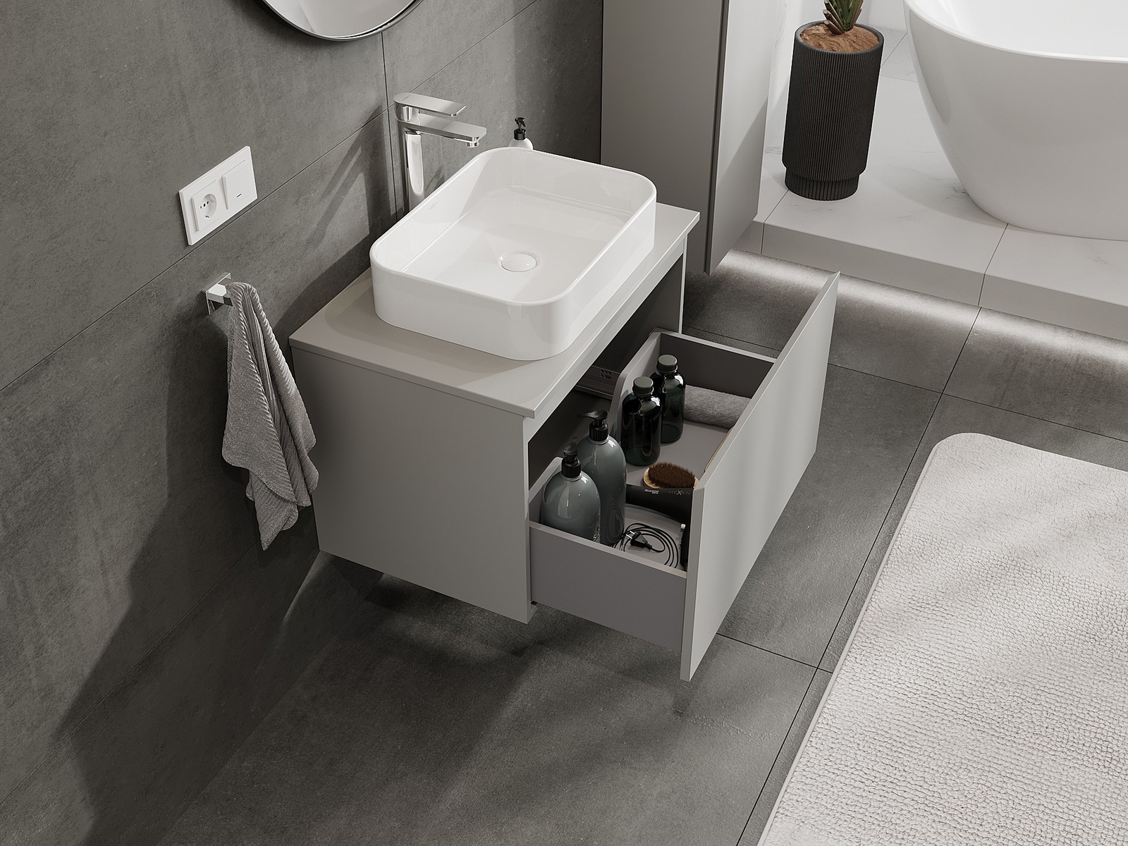 Skivan täckt med högkvalitativ lack är ett utmärkt val för badrummet, den ger ett elegant utseende samt hög motståndskraft mot fukt och repor. Högkvalitativ lack skyddar ytan på bänkskivan, vilket säkerställer dess långvariga hållbarhet, estetik och enkelhet i underhåll.