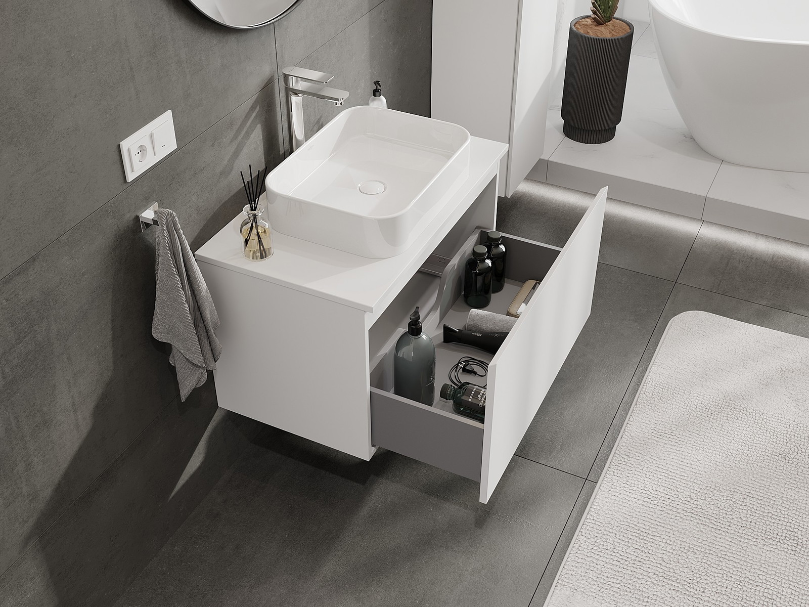 Utskärningen i lådan är utformad på ett sådant sätt att den rymmer vattenlåset som är nödvändigt i tvättställsinstallationer. Tack vare detta kan möbeln installeras fullt ut funktionellt, utan att behöva avstå från utrymme i lådan för installationen.